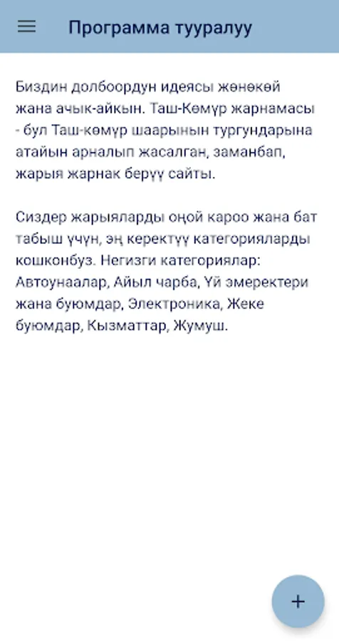 The idea of our project is simple and clear. Tash-Kumyr, Shamalduu-Sai Advertising is a modern advertising application specially designed for residents of Tash-Kumyr, Shamaldy-Sai, Kyzyl-Jar, Tendik, Dostuk, Yntymak, Kyzyl-Jar-12 villages.