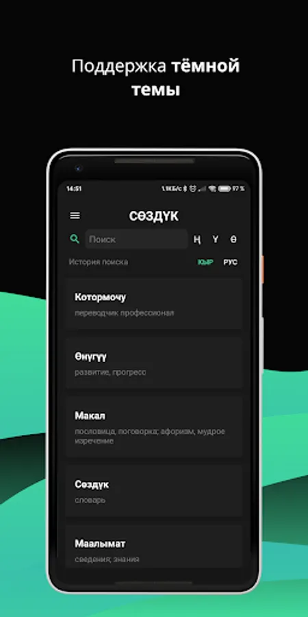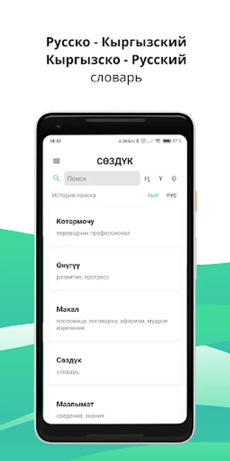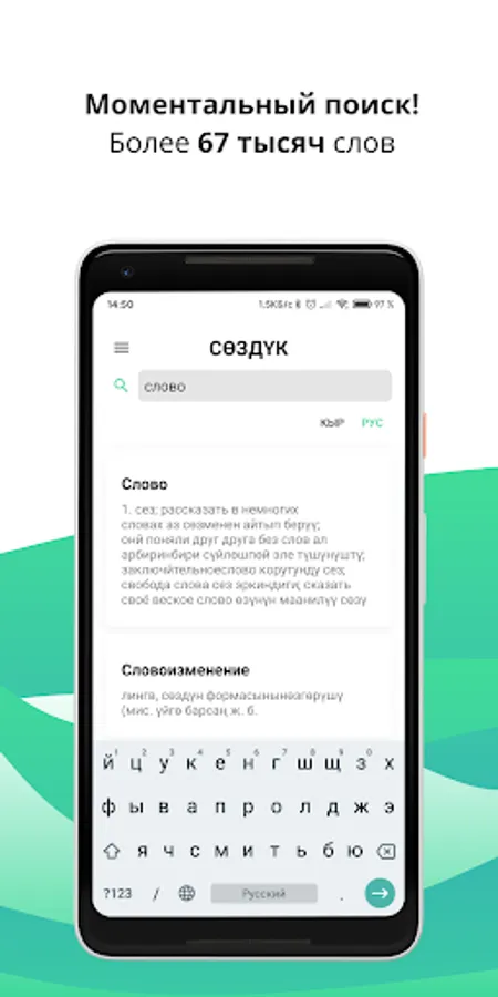 Fast and convenient dictionary of Russian and Kyrgyz languages in your pocket.