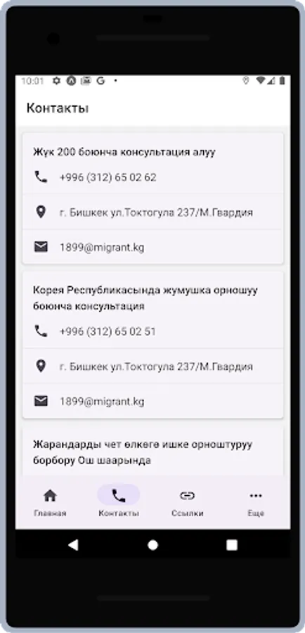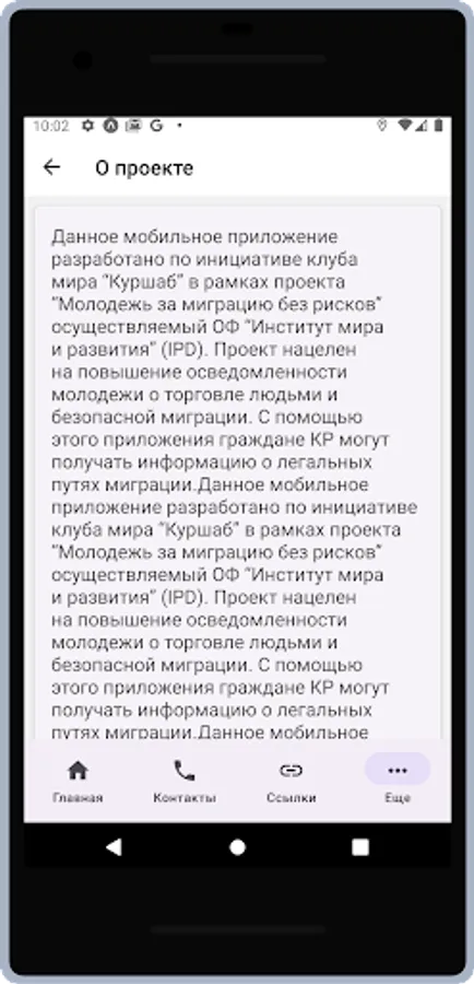 This mobile application was developed on the initiative of the Kurshab Peace Club within the framework of the Youth for Risk-Free Migration project implemented by the Public Foundation Institute for Peace and Development (IPD). The project aims to raise awareness among young people about human trafficking and safe migration. With the help of this application, citizens of the Kyrgyz Republic can receive information about legal migration routes.