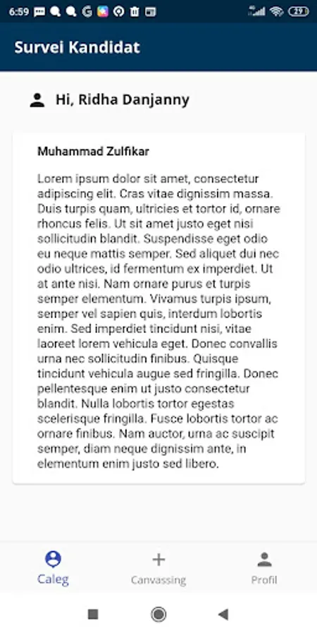 Aplikasi yang membantu canvasser dalam menghimpun data survei responden dengan fitur offline mode dimana canvasser dapat tetap bertugas meskipun tanpa koneksi internet. Data yang dihimpun oleh responden secara real-time akan dianalisa dan hasilnya akan ditampilkan berupa chart