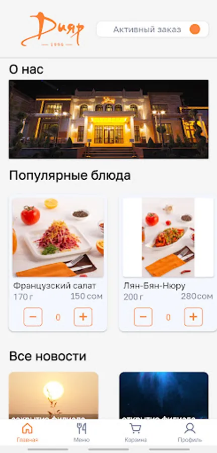 For over 25 years, the "Diyar" restaurant has been pleasing its visitors with delicious food and a pleasant atmosphere. Now "Diyar" has become closer and more accessible. We offer you the Diyar Express mobile application, where you can order your favorite meals with delivery. You just need to download the application, select items from the menu and specify the delivery address, while you can monitor the status of the order ("accepted", "in the kitchen", "handed over to the courier", etc.). You can also order for self-pickup, you just order the dish and indicate the time.