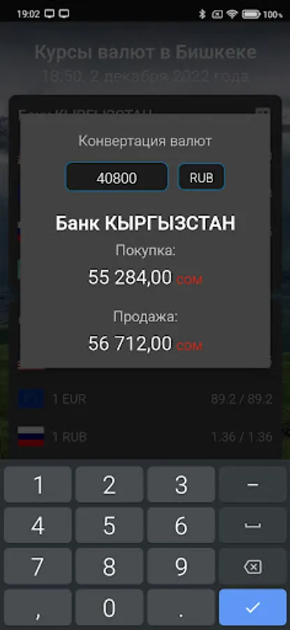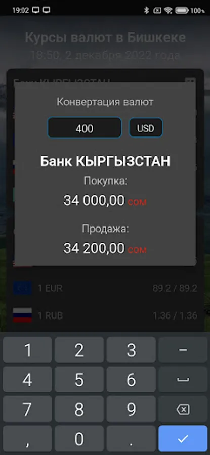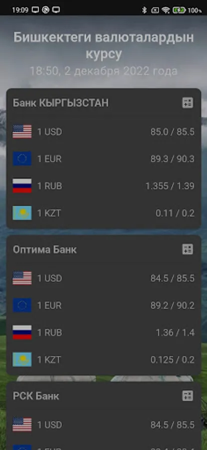 Applications for quick access to Bishkek exchange rates, the list contains several banks with the current rate. It is possible to open the currency converter (calculator) by clicking on the bank card. The application is absolutely free