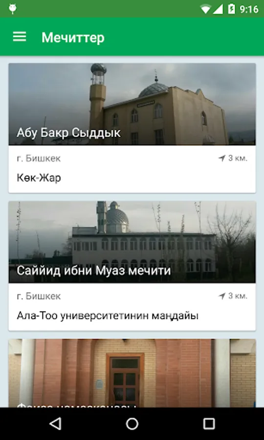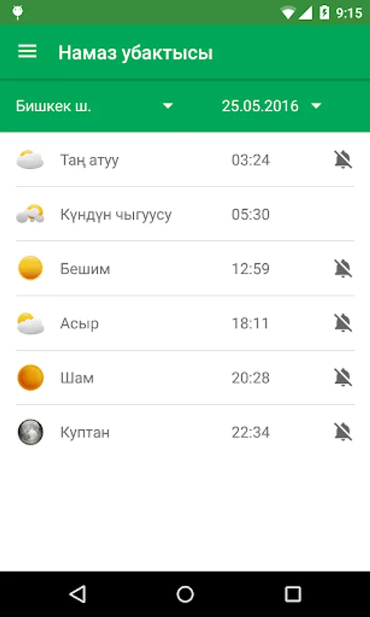 - Кыргызстан боюнча намаз убактысы (Бишкек, Ош, Балыкчы, Баткен, Жалал-Абад, Исфана, Каракол, Кызыл-Кыя, Нарын, Талас, Чаек)