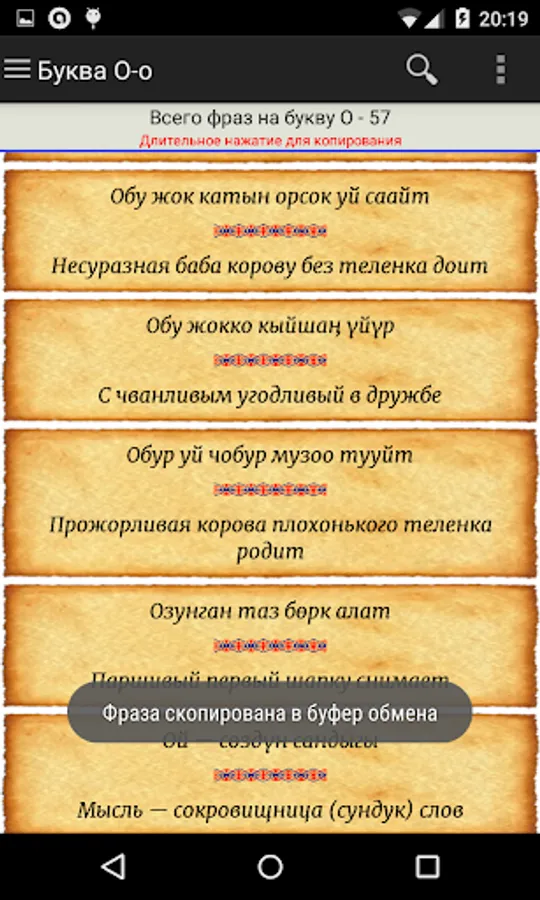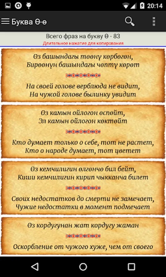 Currently, the collection contains more than 2,000 proverbs and sayings in the Kyrgyz language. There is also a Russian translation or analogue in Russian proverb, similar in meaning to the original in the Kyrgyz language.