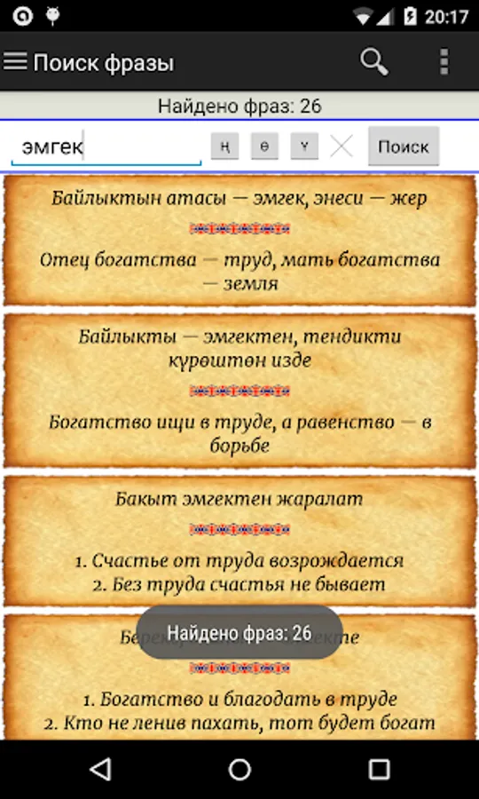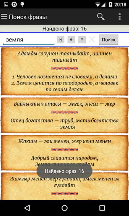 It is possible to search for a word or phrase in the database as the Kyrgyz and Russian languages.