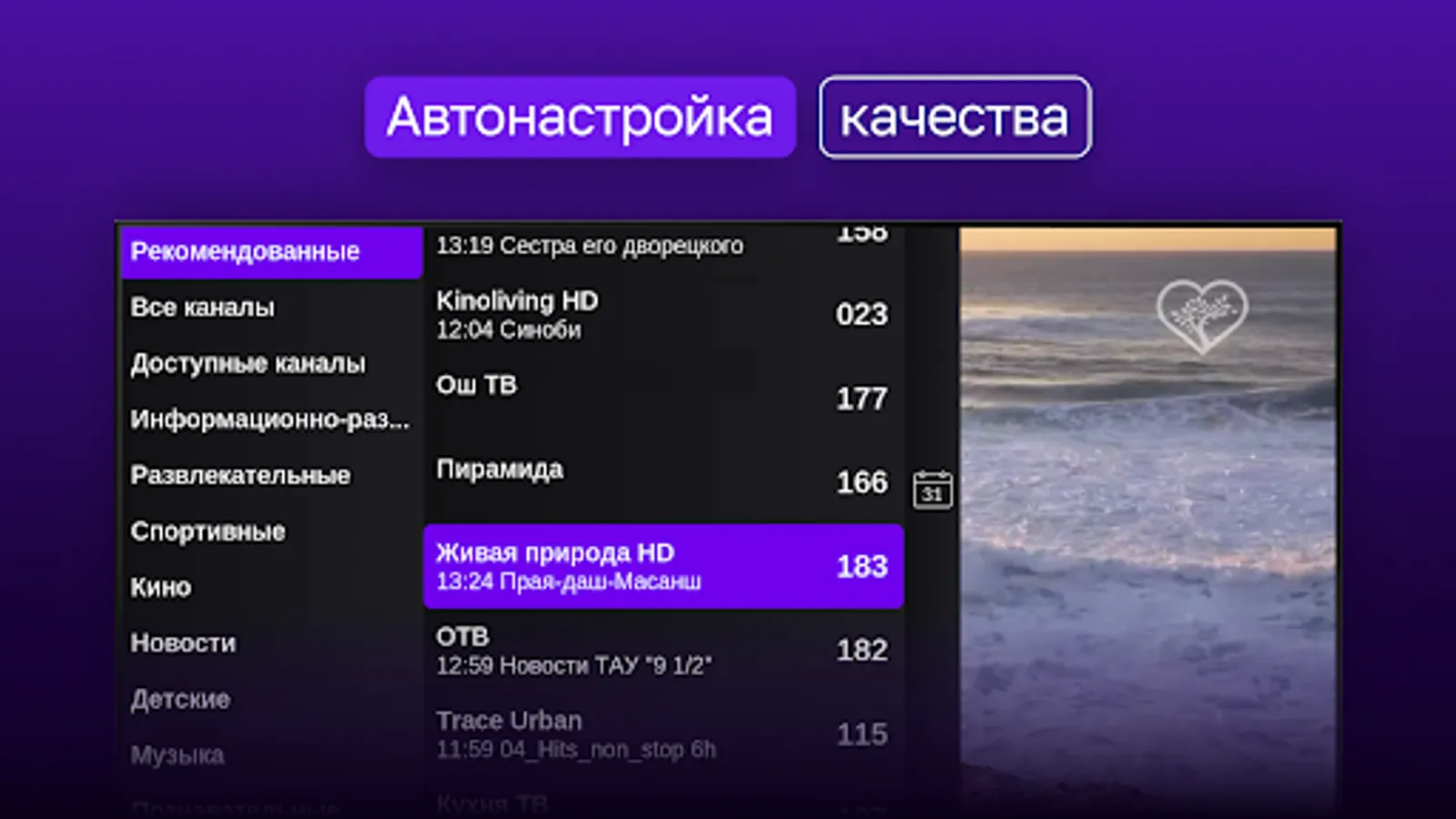 Modern television Mega TV: a simple and convenient interface, a variety of TV channels, an archive of TV shows, a movie catalog, personal recommendations and much more.