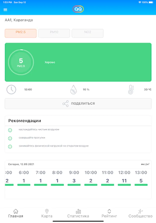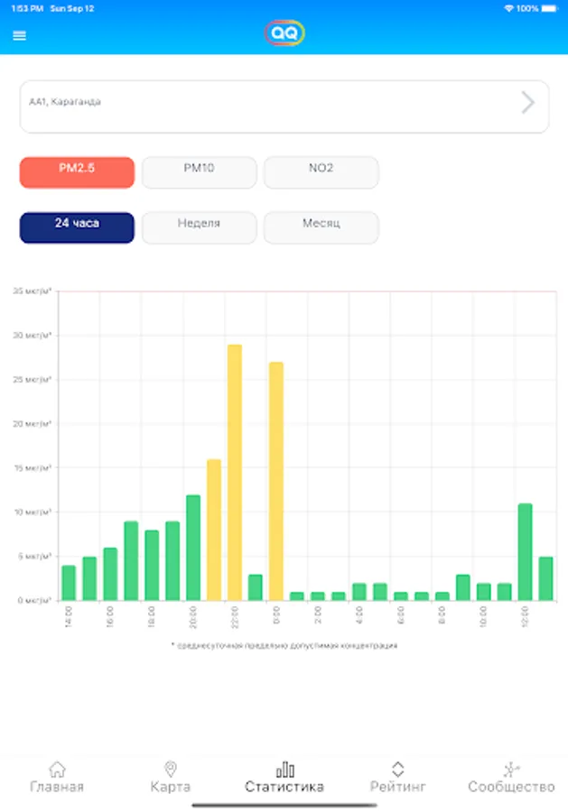The actual data can be accessed from each sensor separately. In addition to information on the level of pollution by substances, the application also provides data on temperature and humidity. In addition, using the mobile application, you can view statistics for a specific period: day, week and month. The data received from the sensors is updated every 1 to 3 hours.