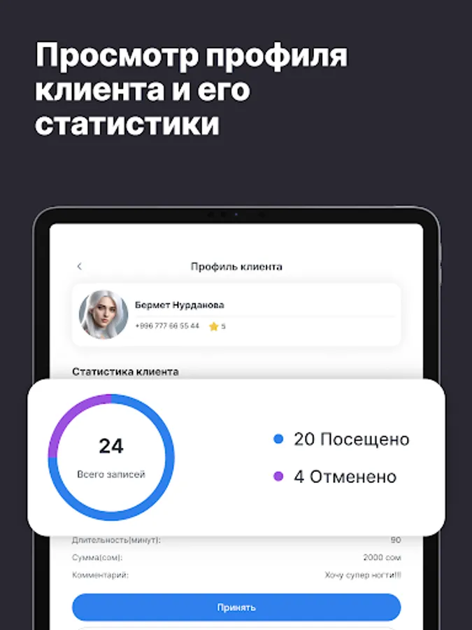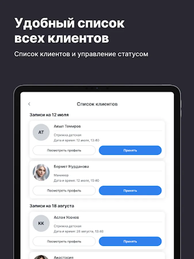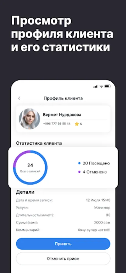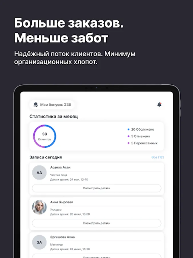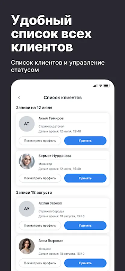 Приложение помогает мастерам сосредоточиться на работе с клиентами, а не на рутине. Всё, что нужно для ведения и развития бизнеса — в одном месте, всегда под рукой.