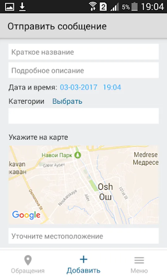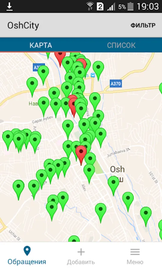 Map designed for placement on the needs of citizens on municipal services and is the operational mode of communication between the citizens and the City of Osh. The card can serve as a way of monitoring and evaluation of the municipal services.