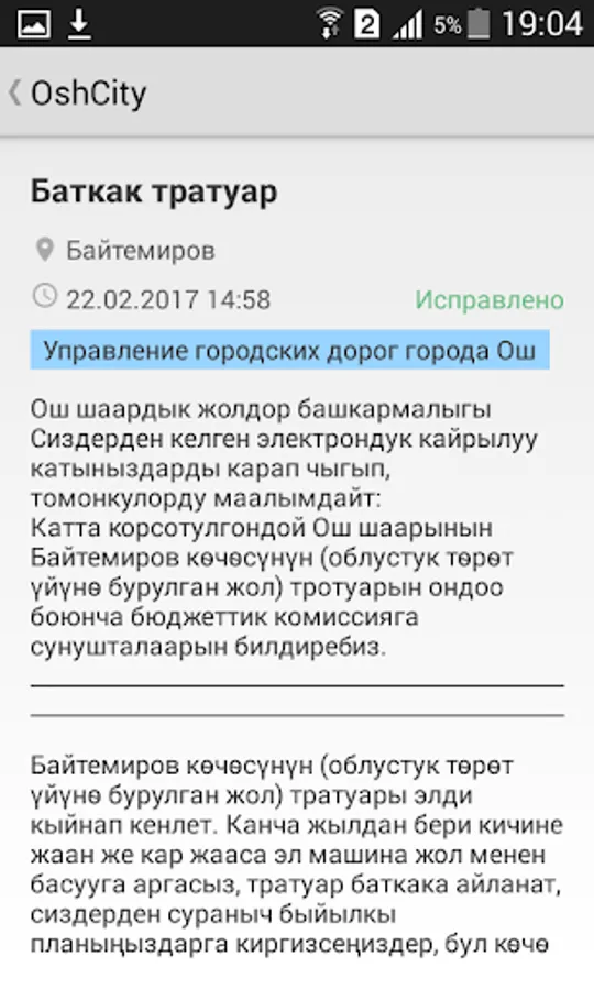 The main objective of the project "Online map of Osh city population calls" is to promote the openness of the local authorities and the strengthening of effective interaction between the residents of the city of Osh. The project aims to assist in improving the quality of municipal services of the city of Osh.