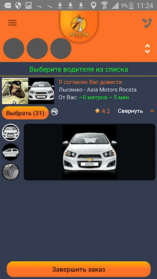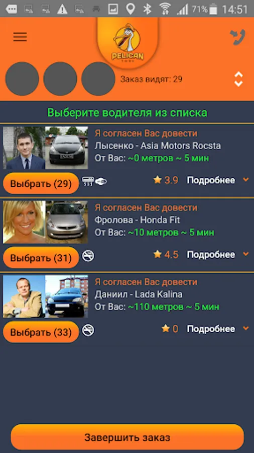-Passazhir Sees the name and age of the driver, the make and license plate number, the number of completed orders. Making a request, the passenger can filter drivers an estimated set by previous passengers.