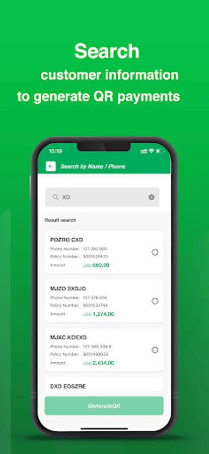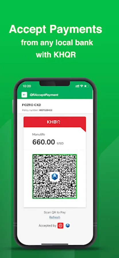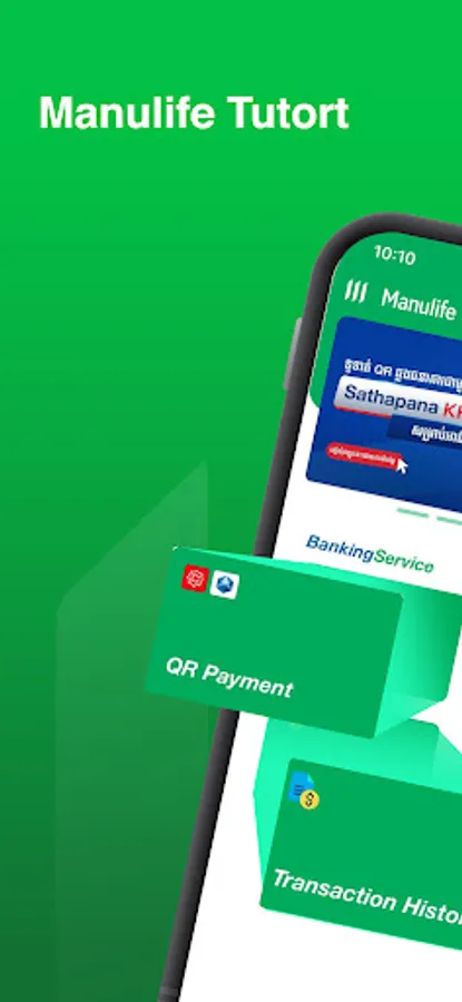 Manulife Merchant app is for Manulife agents to collect payment of insurance premiums by Manulife Insurance policies or proposal numbers. The features include login, onboard, forget password, change password, view profile, change languages, enable/disable biometrics, collect with KHQR and cash (by name/phone, and policy number/proposal), transaction history, and send digital invoice.