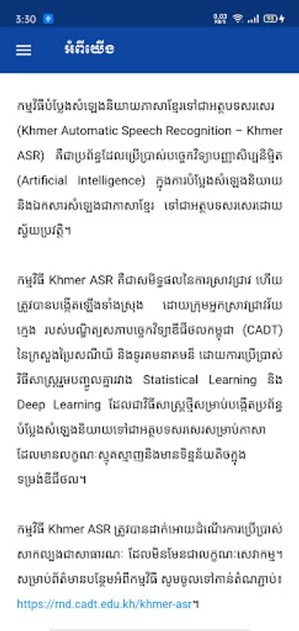 This application was entirely developed by a team of young researchers from Cambodia Academy of Digital Technology (formerly known as National Institute of Posts, Telecommunications, and ICT) of the Ministry of Posts and Telecommunications, using a combination of Statistical Learning and Deep Learning methods, which are the new automation approaches for converting speech into written text for complex script languages with less digital data.