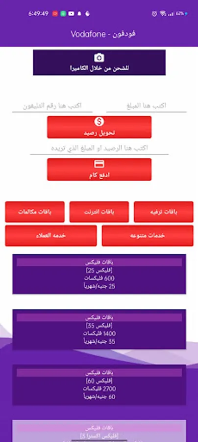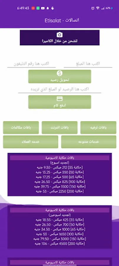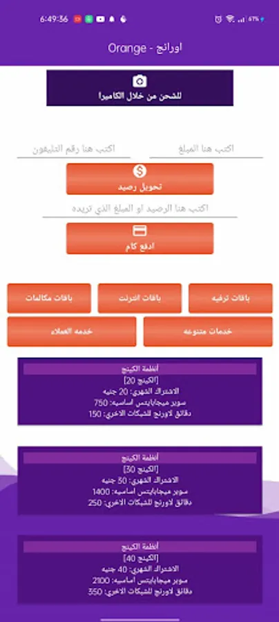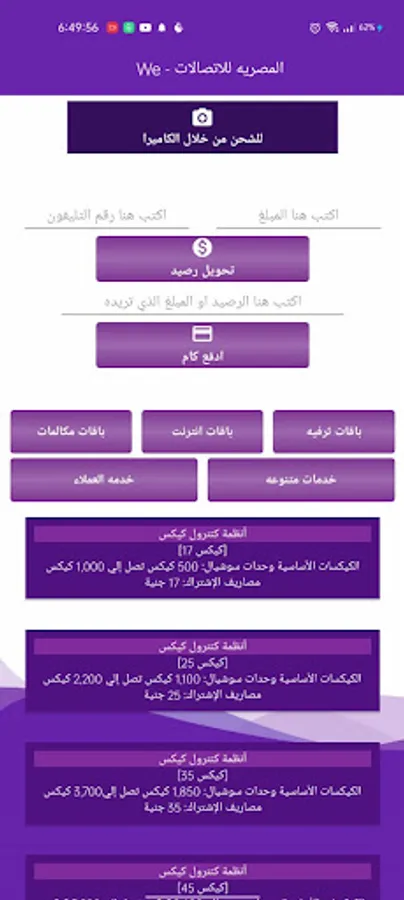 كما يسمح التطبيق باستخدام الكاميرا لقراءة كود الشحن الموجود على الكارت سواء كان ورقي او الكارت الاصلي للشركة.