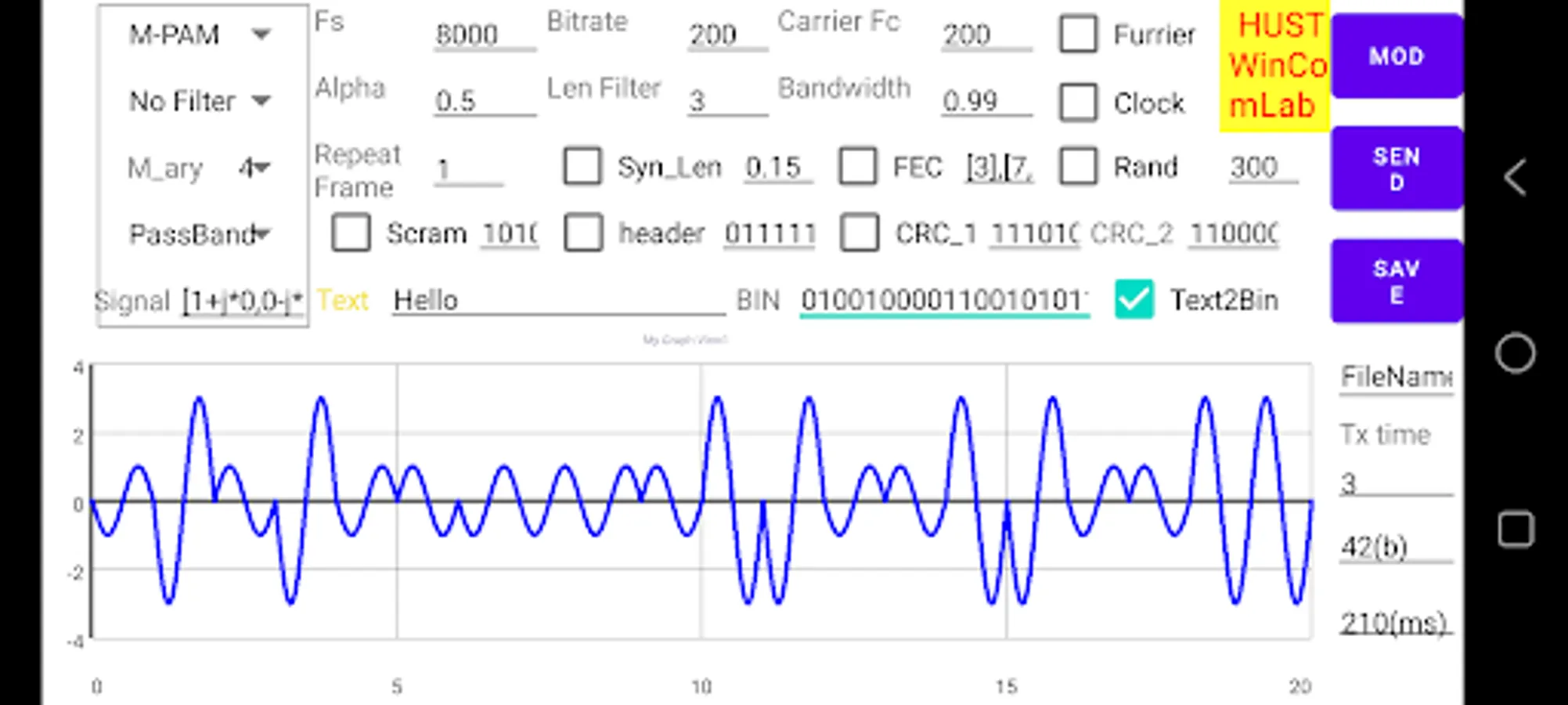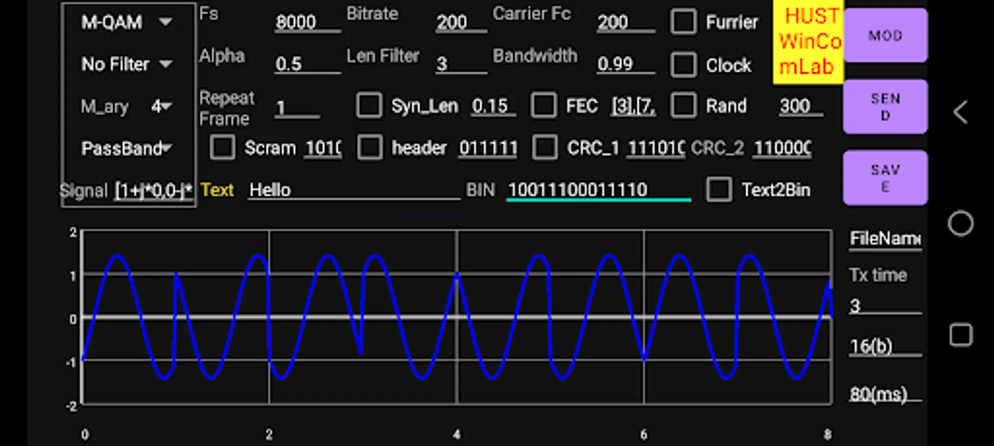 This is free Version so set some limitations: maximum 50bits, and Sample Frequency <8000Hz, and Modulation level <=4. And user can not zoom in screen by touch