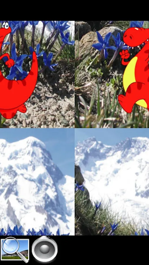Scratch: Draw your finger over the screen to clear out a piece of the image. This is the least game-like of the 5, but it is also the one with the most creative freedom. With three thicknesses of the pen and three modes, you or your child can create nice effects or frames on the pictures. There’s Block Mode, that blocks out the image with a blue screen. As you draw over the screen, you see more of the image underneath. A creative person might make a nice frame or draw figures on the blue surface. The Black And White mode has a B/W image and as you draw over it, you get colors. The Frost Mode makes the image look like you’re seeing it through a window with frost all over it. As you draw, you clear some of the frost, making it look like you’re scratching away the frost on the window to peek inside.