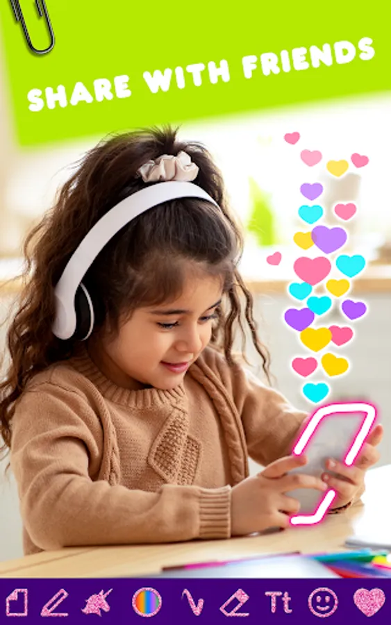 π We have many painting brushes: neon paint, stars drawing, hearts paint, glow paint, sketch drawing, rainbow painting, paint on a black background!