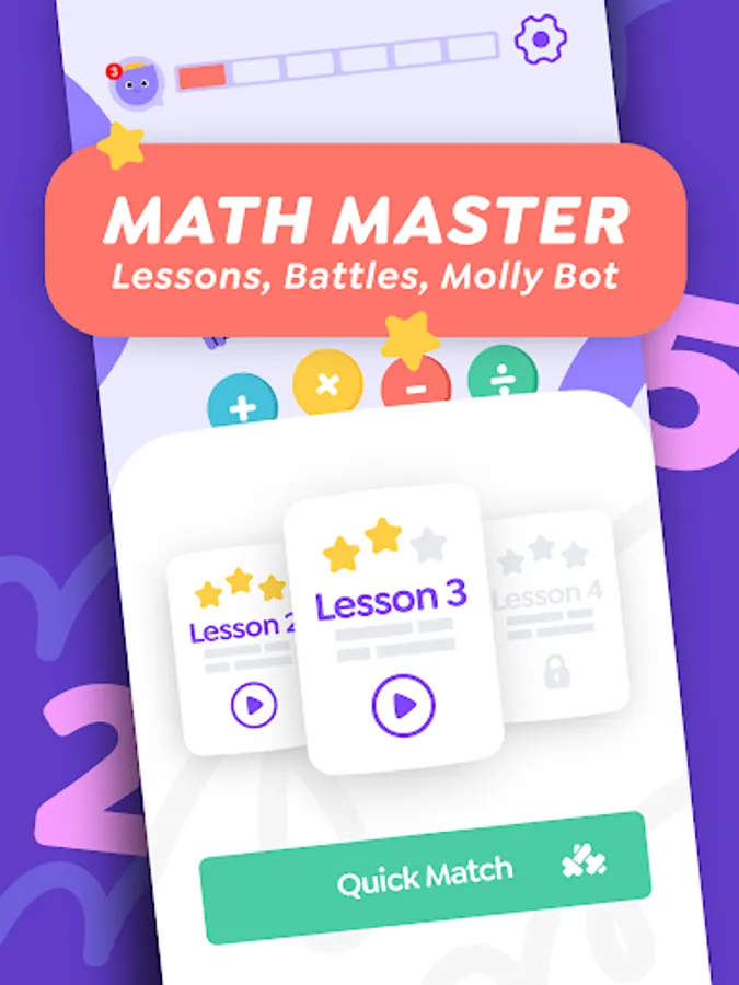 Learn Math Master is the ultimate math learning app with over 10,000 lessons, math battles, and a personal math tutor in the form of Molly bot. Master math with handwriting recognition technology, chat with Molly to solve math equations, and compete with other kids in real-time math battles.