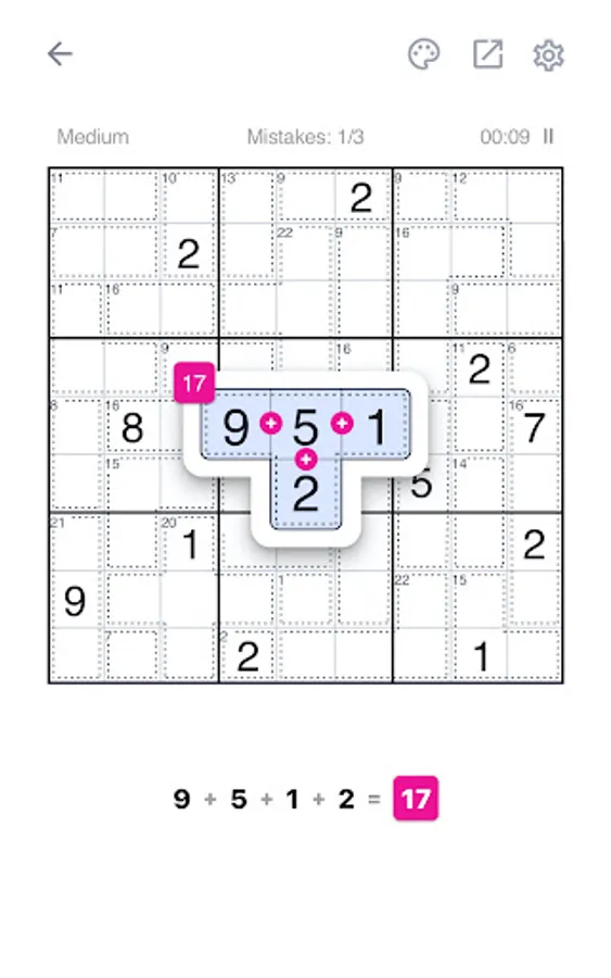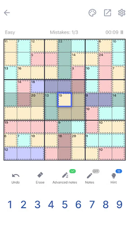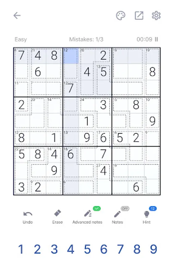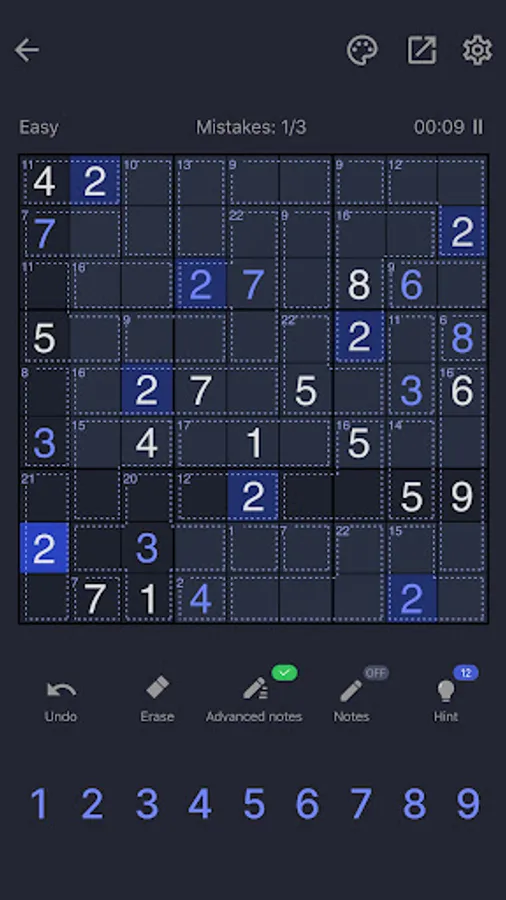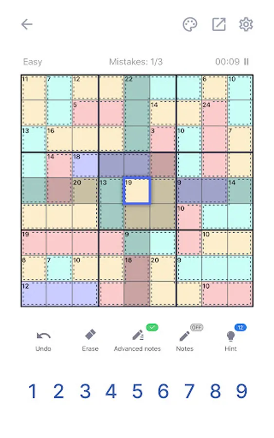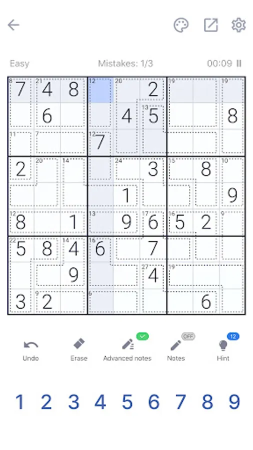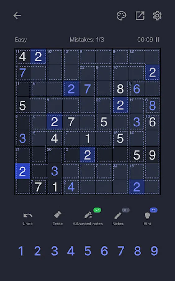 Killer Sudoku may be a little bit harder than a classic sudoku puzzle game, no worries! We offer several balanced difficulty levels for beginners and advanced players! The game has the function to add or remove notes during gameplay. Did you make a mistake at the beginning? No worries, there are undo and hint functions! Get it back fast!