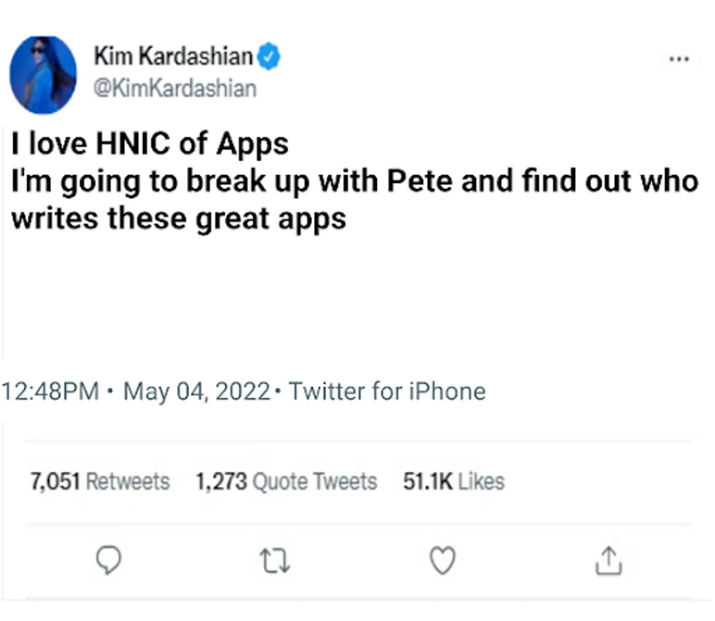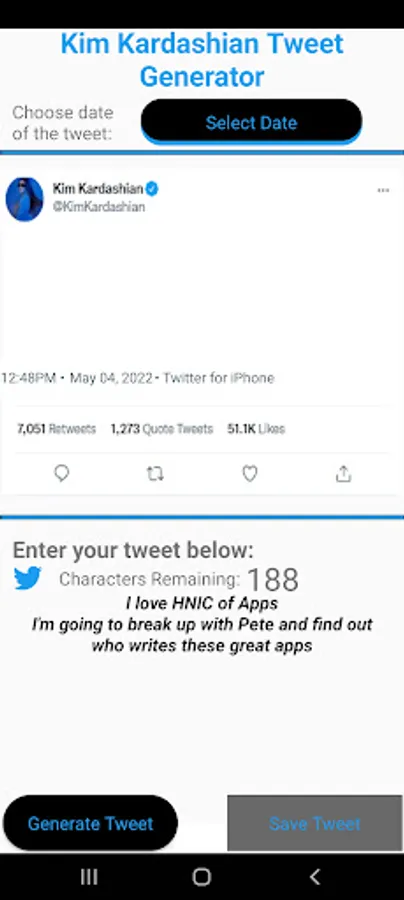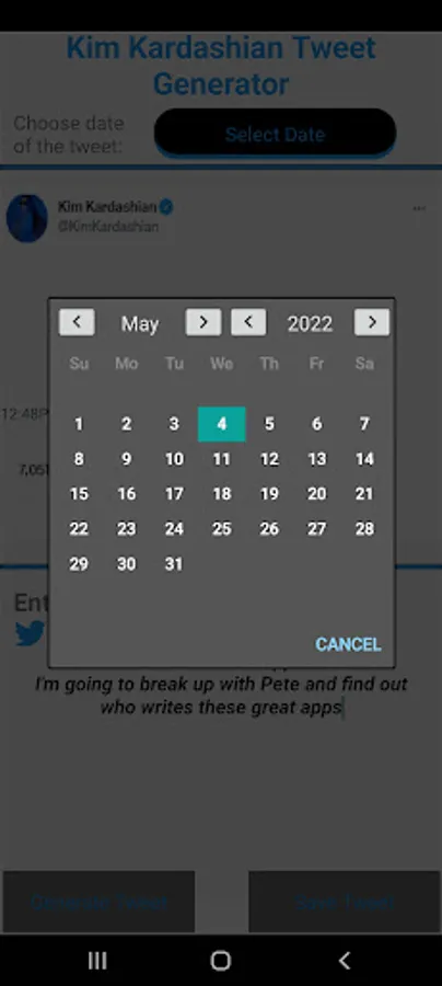 This simple app lets you choose a date and a customized twitter message and creates a meme that looks as though Kim Kardashian tweeted the message.