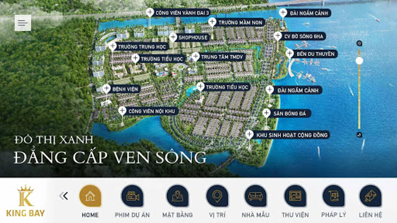 King Bay Complex urban ecological area is located in a strategic and unique location at the eastern gateway of Ho Chi Minh City, with modern transport system and synchronous investment. Being endowed with 3 façades of Dong Nai river, King Bay possesses a rare and precious feng shui location, the source of prosperity, wealth and health for owners.