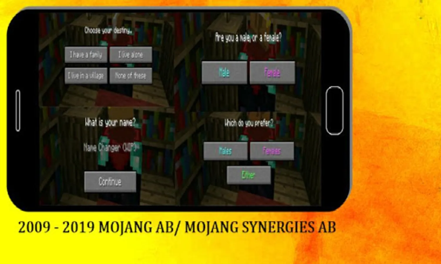 Next you will find yourself in a small room with some bookshelves and an enchantment table. Tap on the enchantment table to begin deciding your destiny. A GUI (graphical user interface) will pop up displaying two different options: Male or Female.