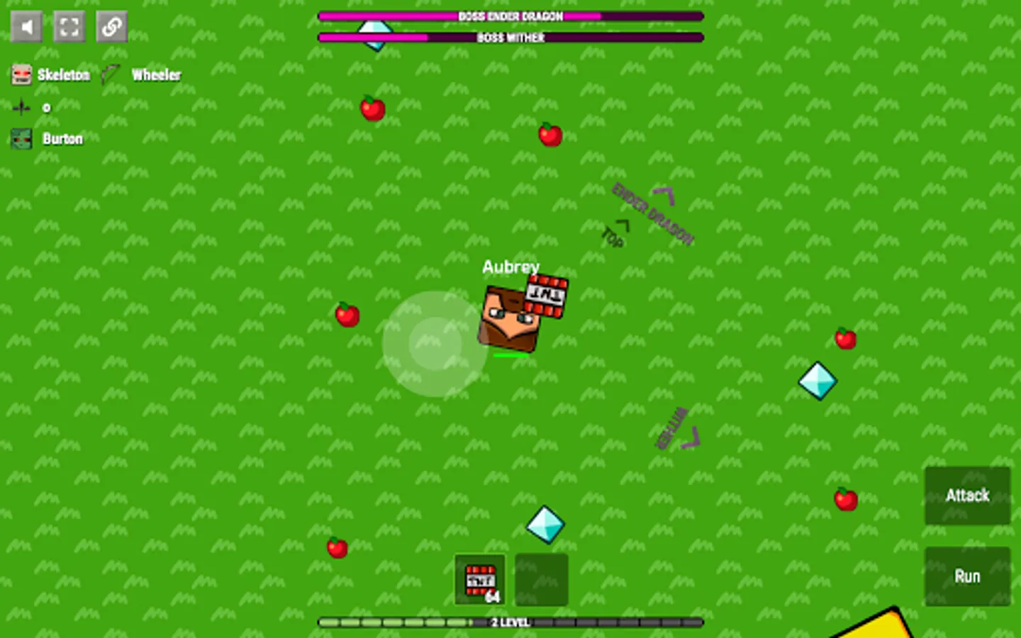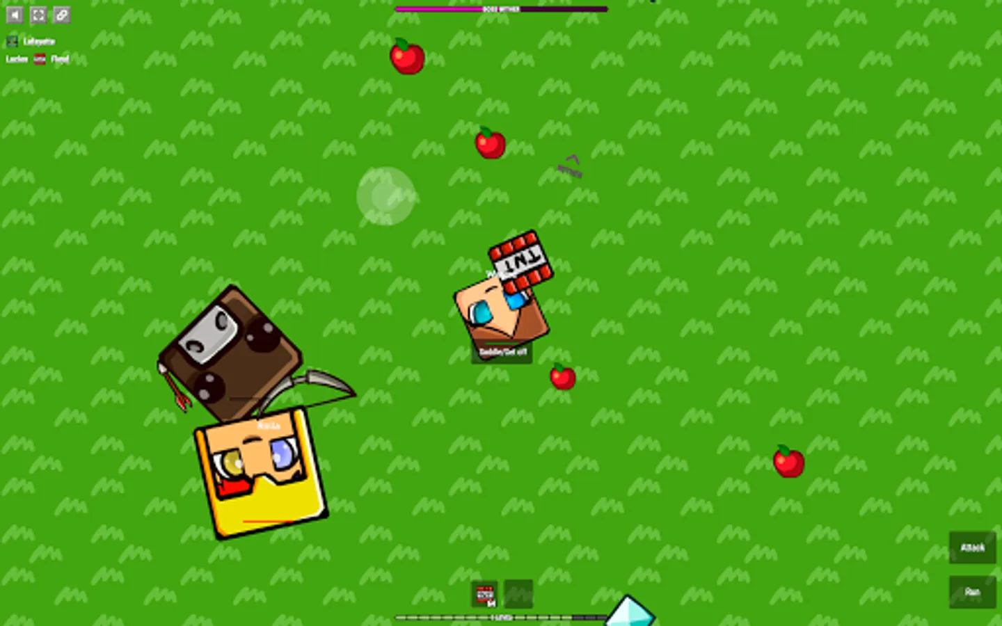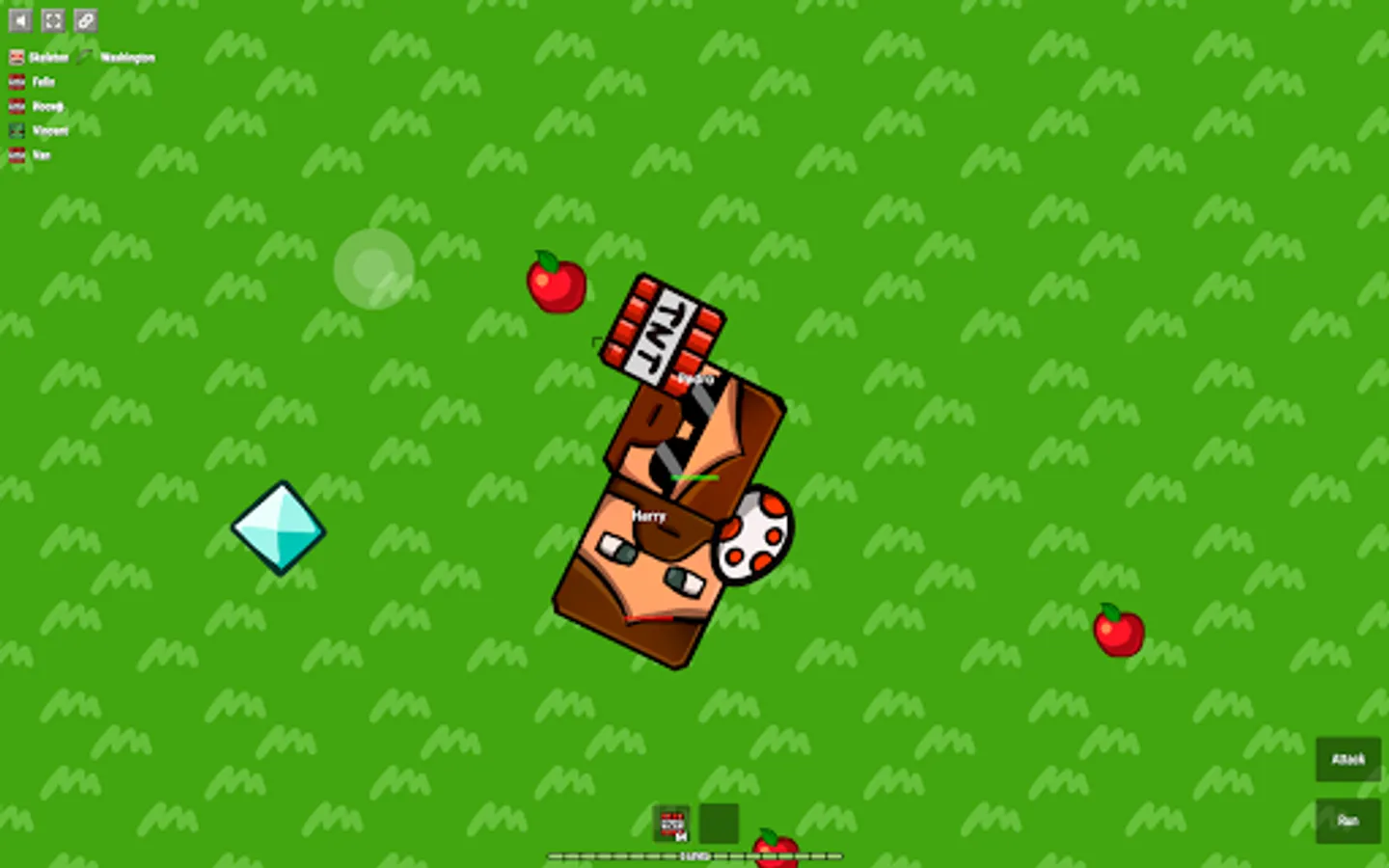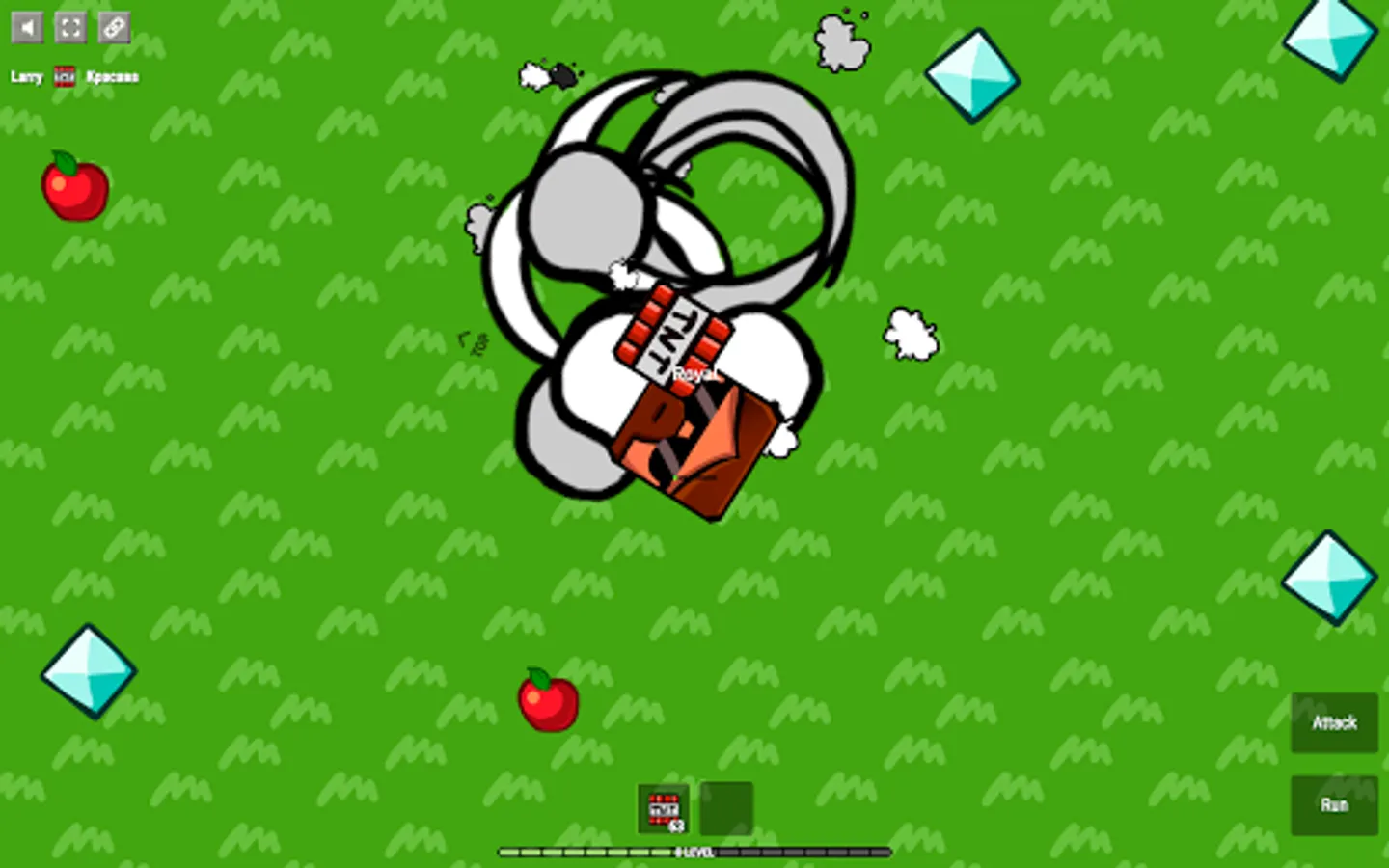 Apples and diamonds appear on the map constantly. Players usually fight in the center and therefore one should periodically look at the edges of the map to collect diamonds.