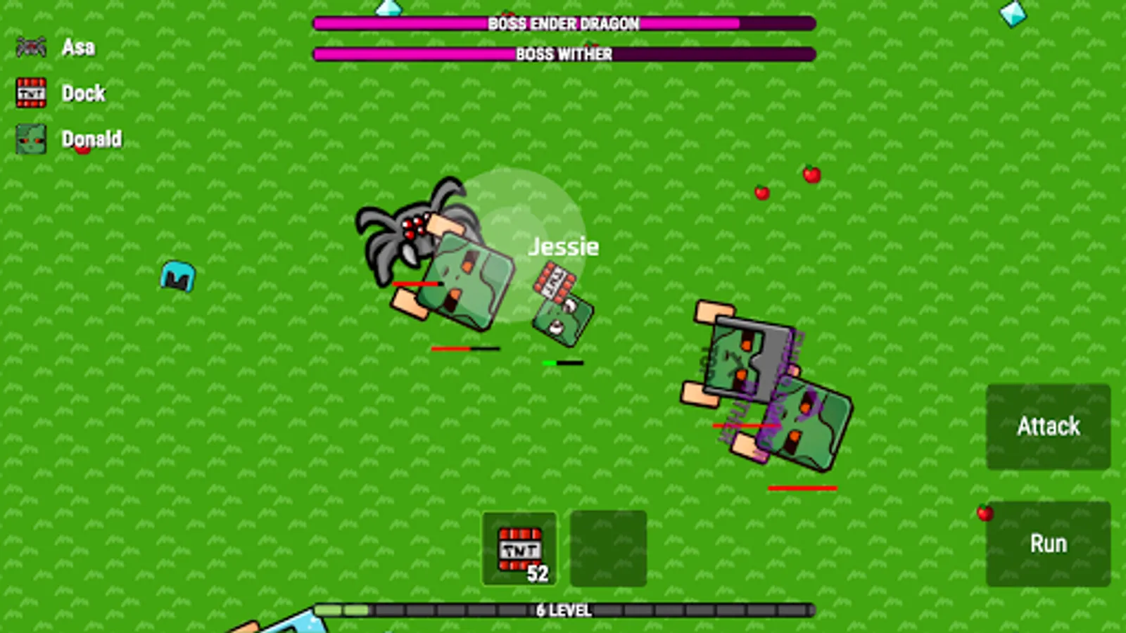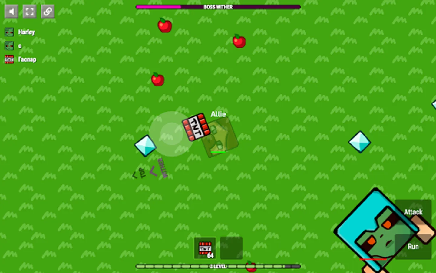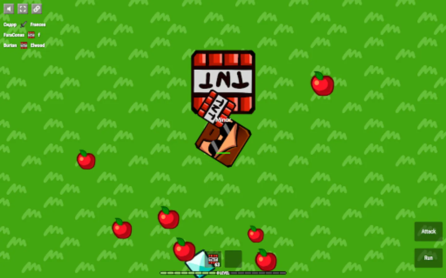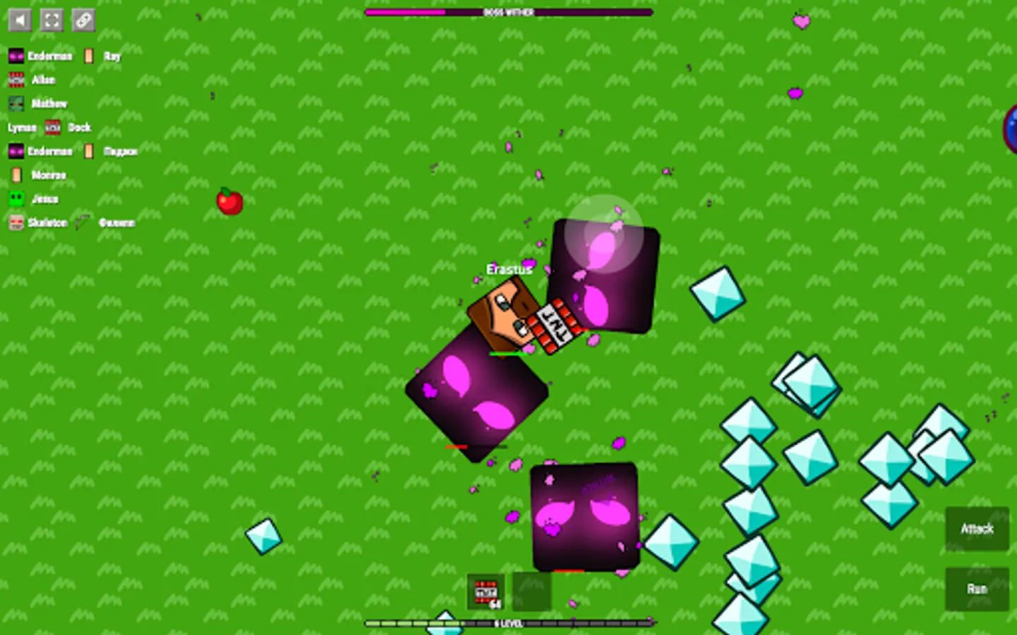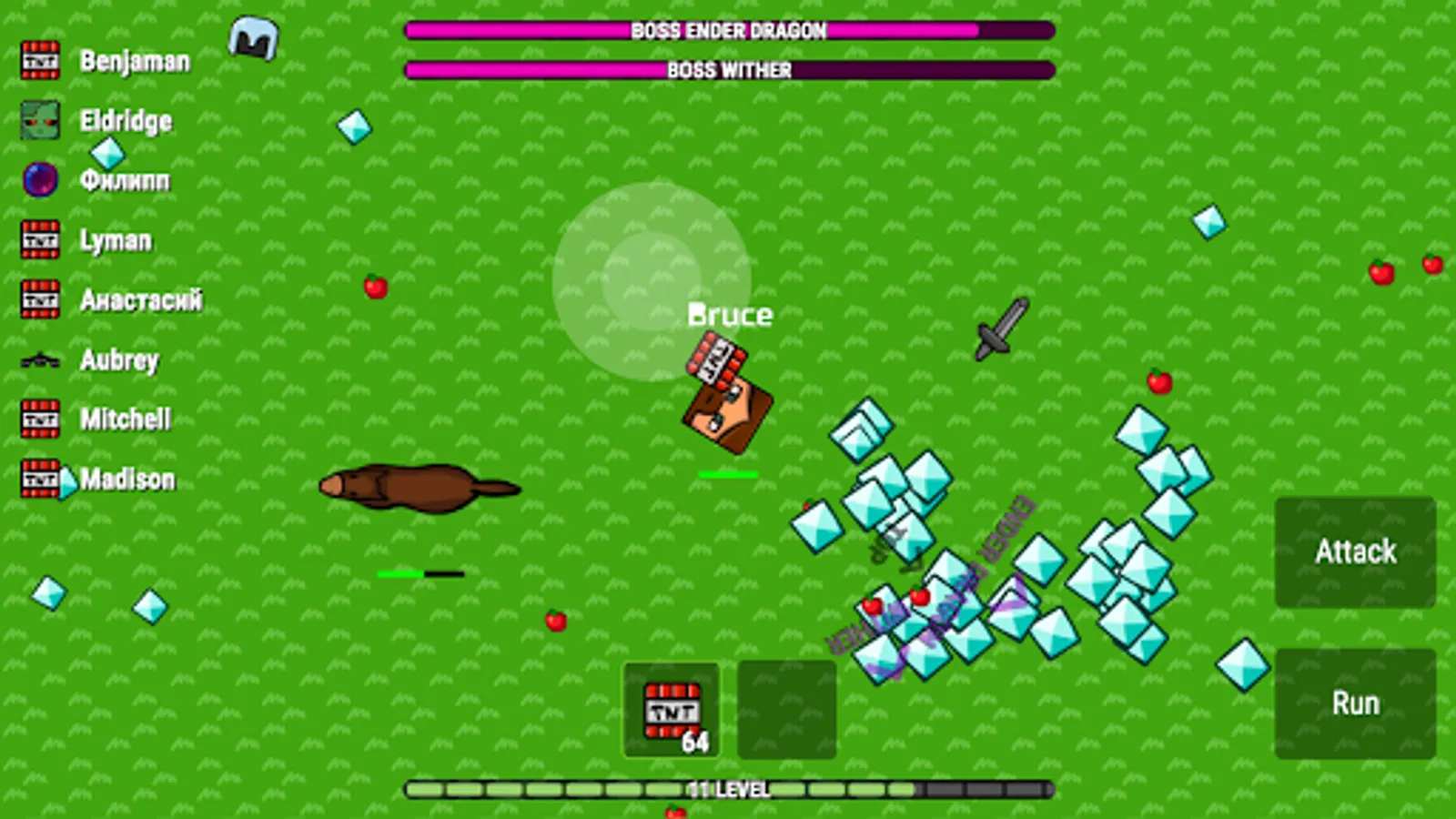 Apples and diamonds appear on the map constantly. Players usually fight in the center and therefore one should periodically look at the edges of the map to collect diamonds.