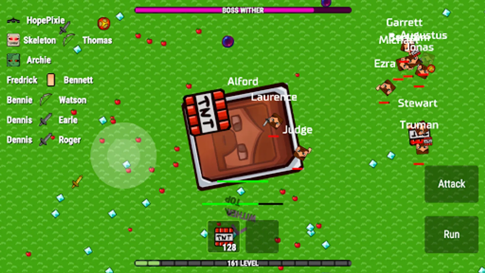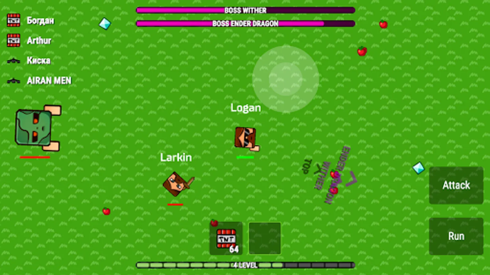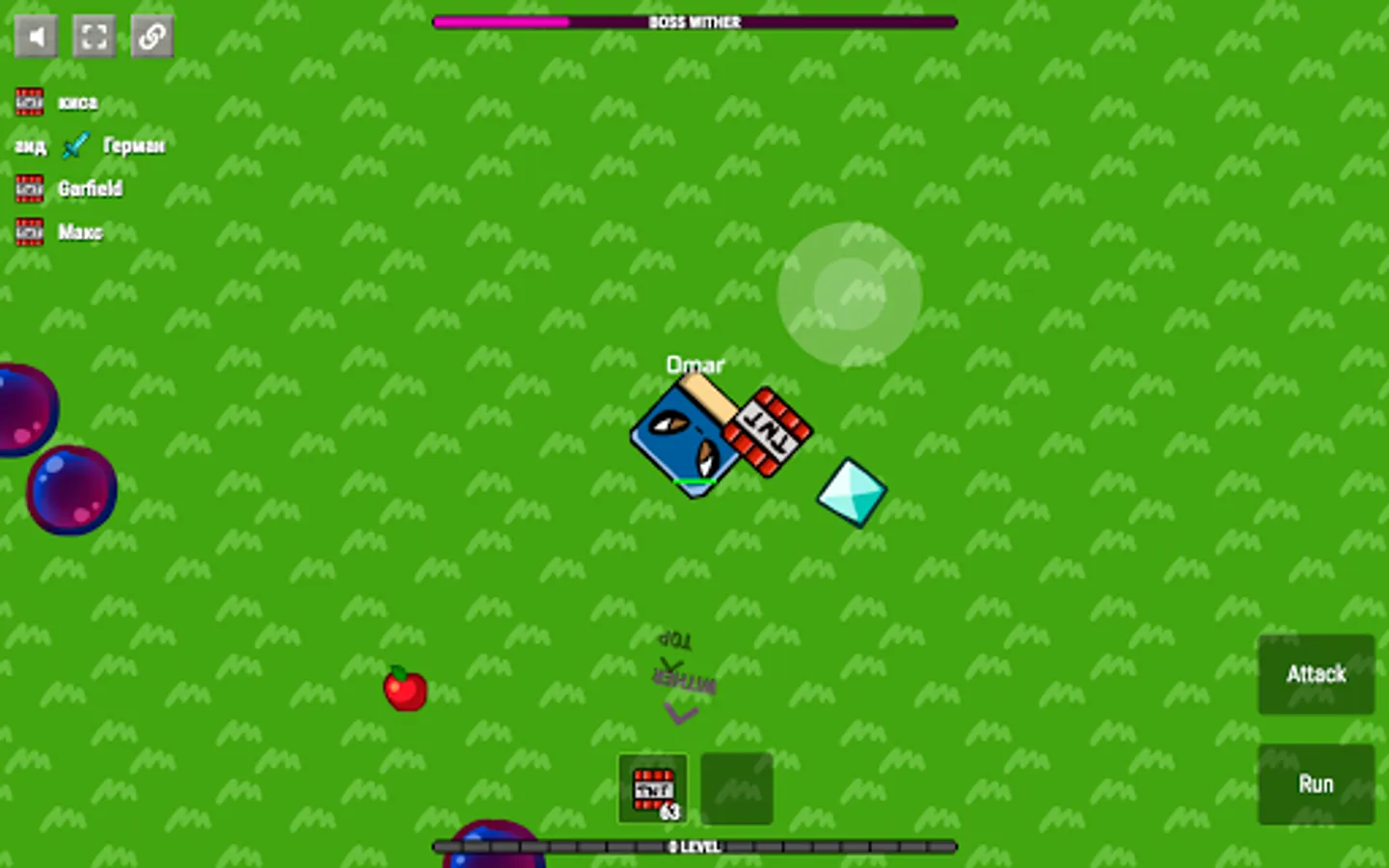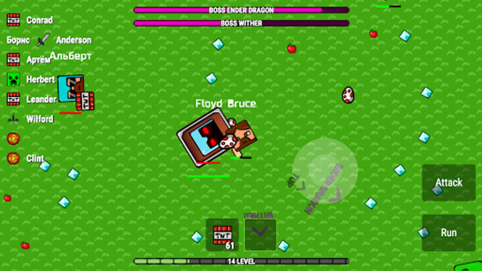 Apples and diamonds appear on the map constantly. Players usually fight in the center and therefore one should periodically look at the edges of the map to collect diamonds.