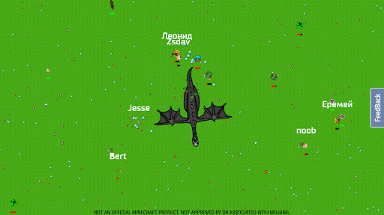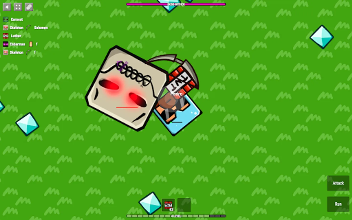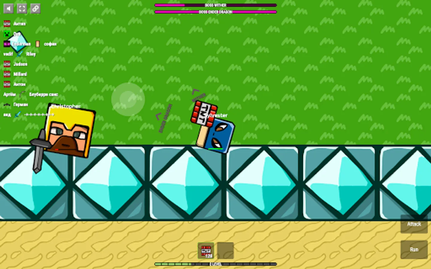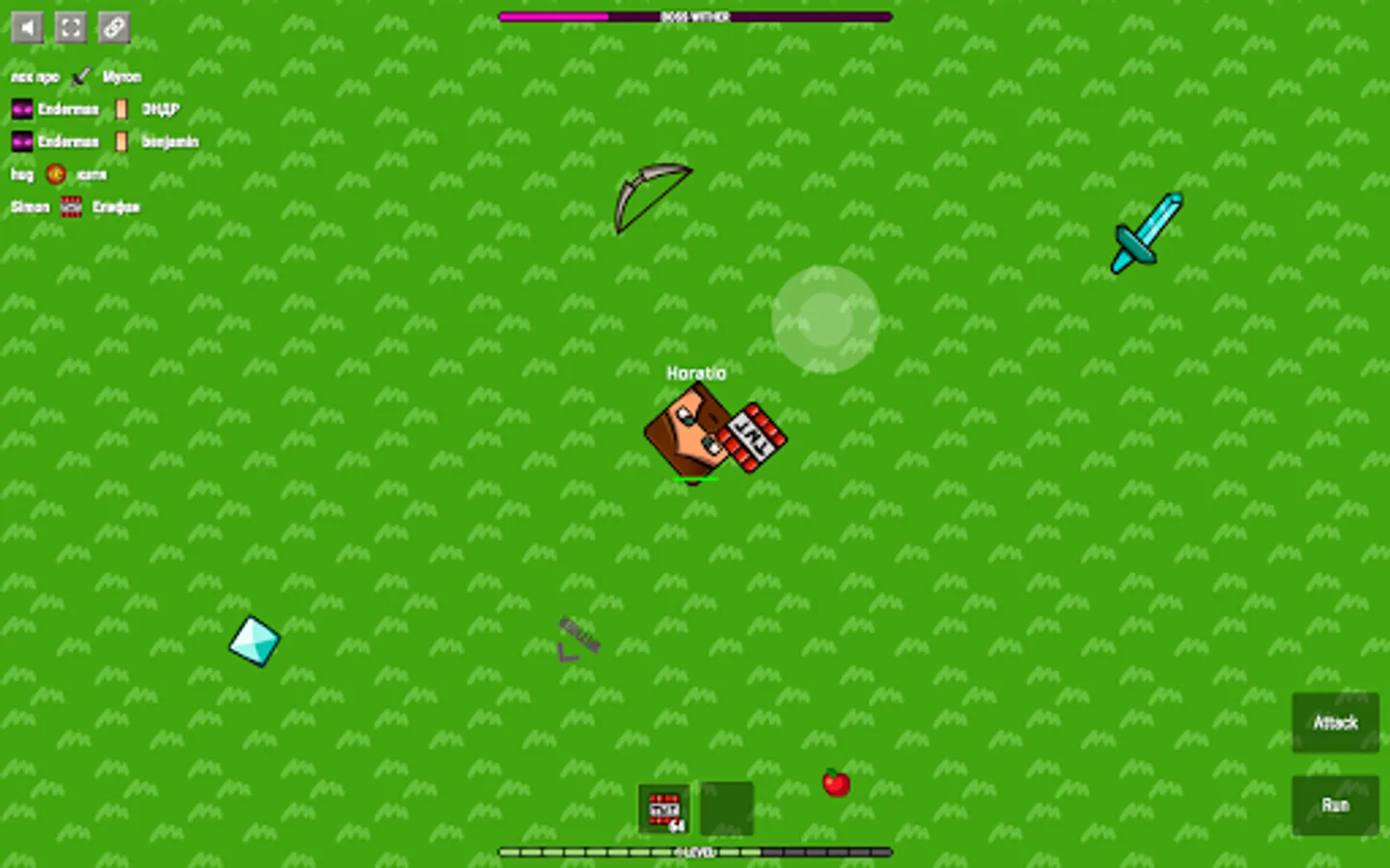 The game CrazySteve.io was created for fun and fast fighting. The main task in CrazySteve.io is to score as many points as possible and be the coolest 😎. To do this, you need to collect diamonds and apples that appear on the map. For diamonds💎, you charge more experience than apples🍎, but thanks to apples you can recovery your health. A lot of diamonds💎💎💎 fall out of the killed rival. Do you understand what we are inclined to? Yes! You need to scatter around the dynamic checkers, shoot from the bow, attack with the sword, shoot from the fireball and use other weapon in every way to kill the rivals🔫, and then take their diamonds to yourself. By the way, be careful, you can undermine yourself, will be more blood! On the map running animals🐷 that you can kill and recovery health.