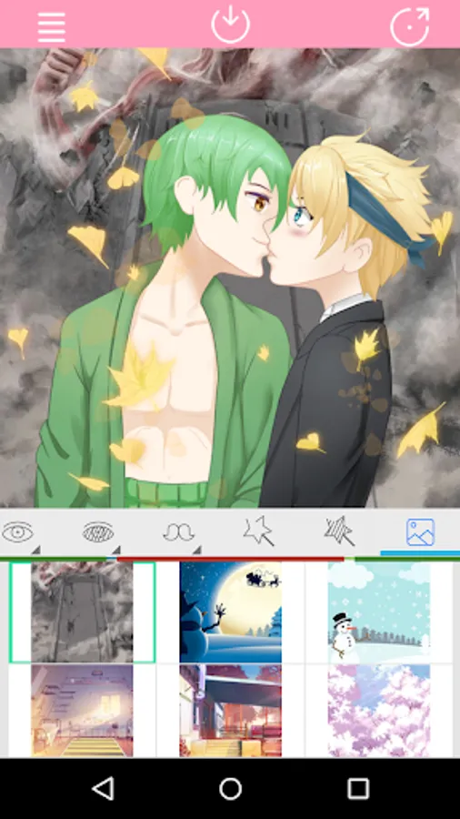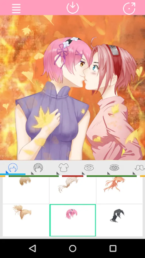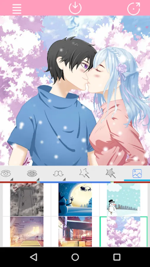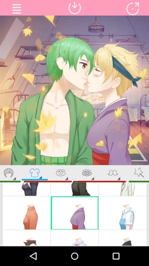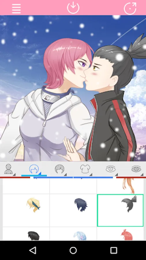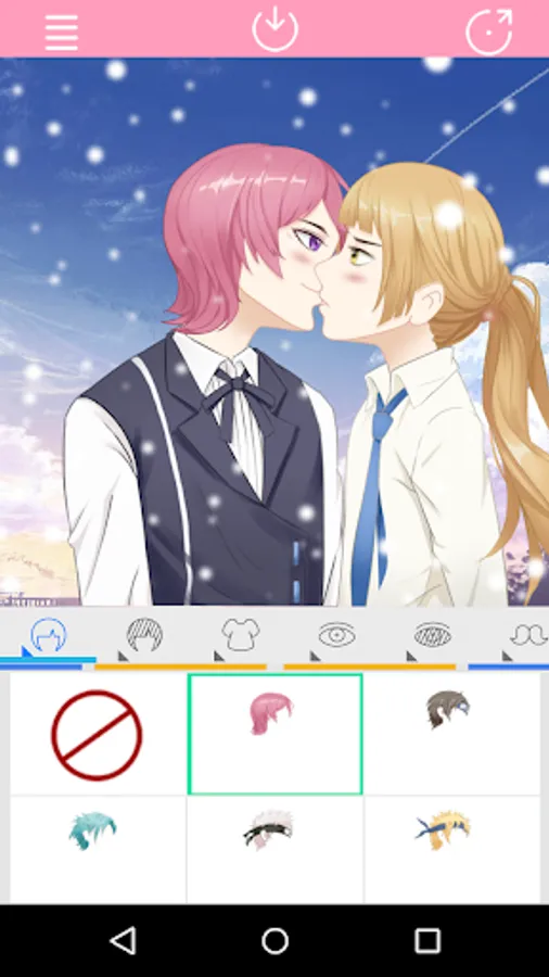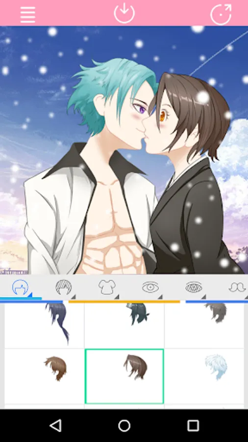 This app is Support click action to select Kissing Anime Couple parts.You can create your favorite characters freely.Moreover,you can also share with your friends.