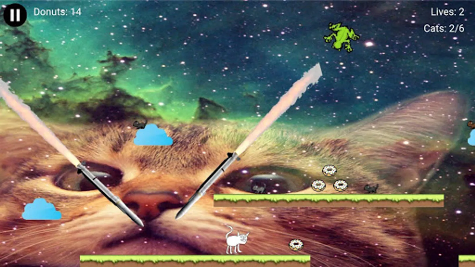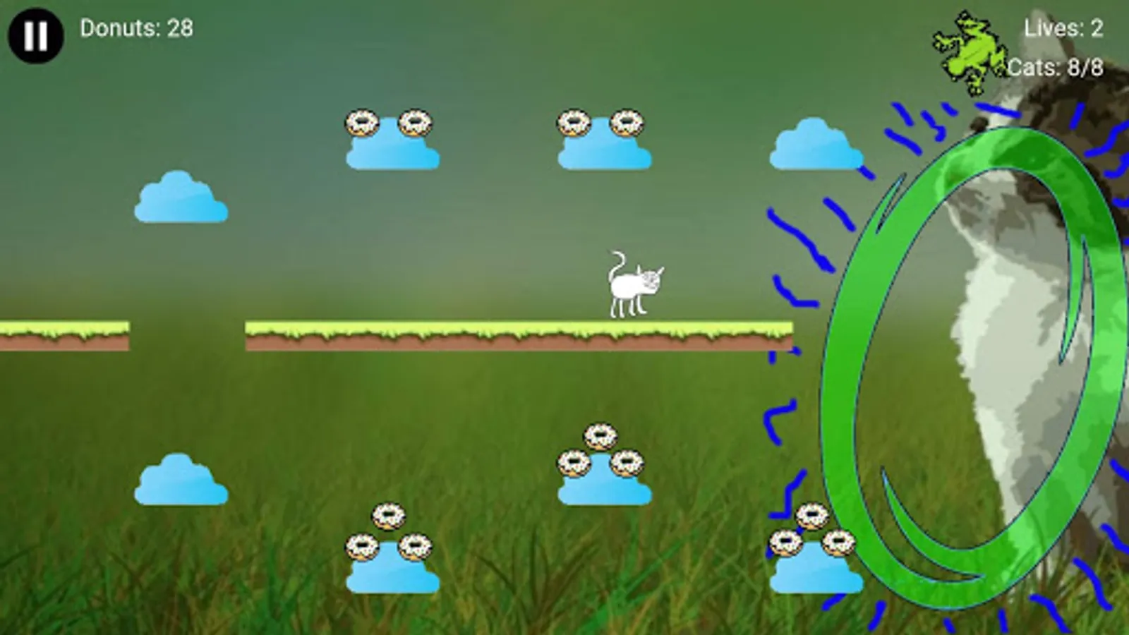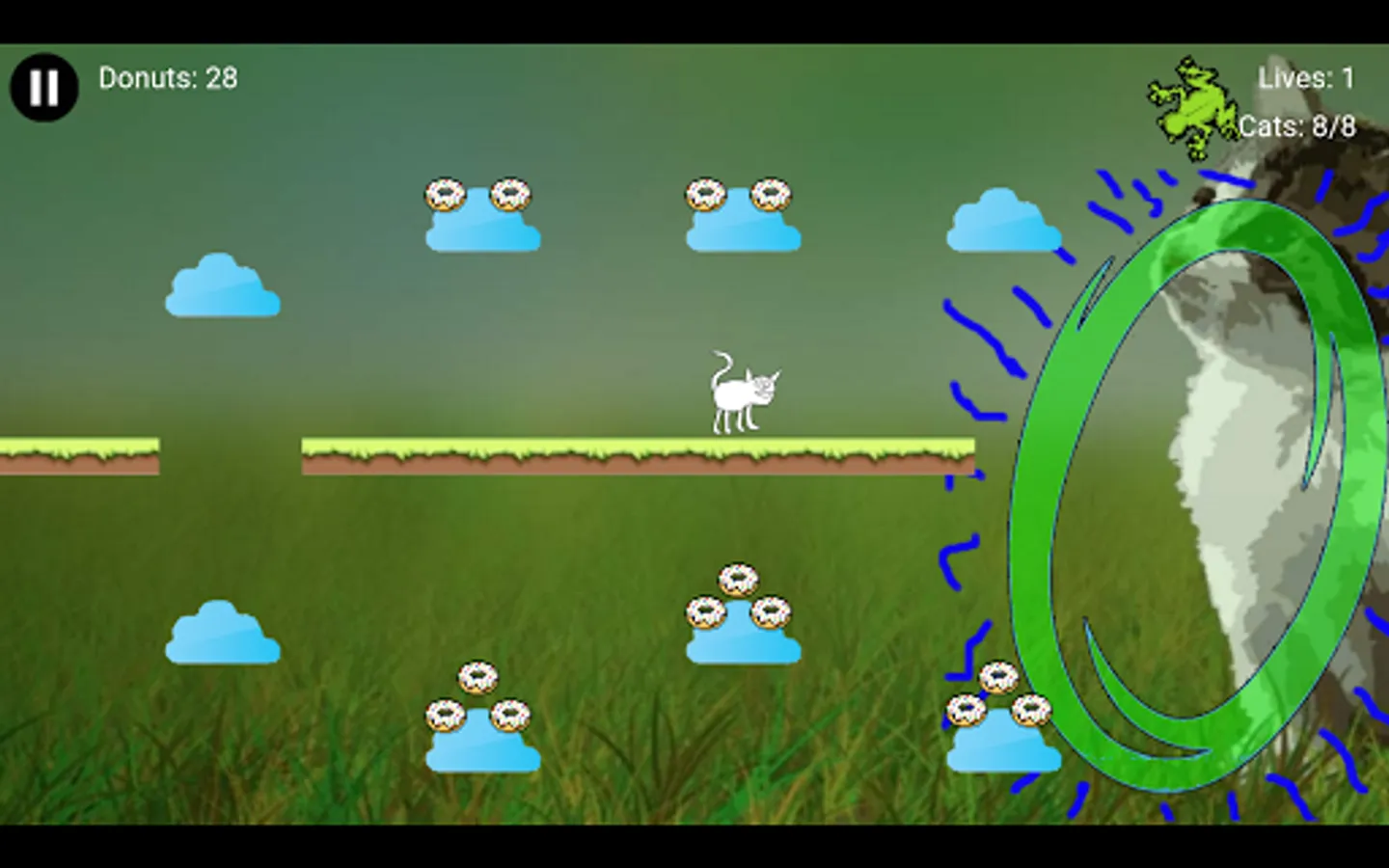You are a cat tasked with saving your fellow felines from certain doom. Use the intuitive touch controls to navigate through distant lands to rescue your friends. Collect all the cats in a stage to trigger the Cosmic Gate to the next level. Throughout your adventure, you my encounter tasty donuts that can be used to purchase more lives. Your fellow cats are counting on you, so Accumulate Some Cats!