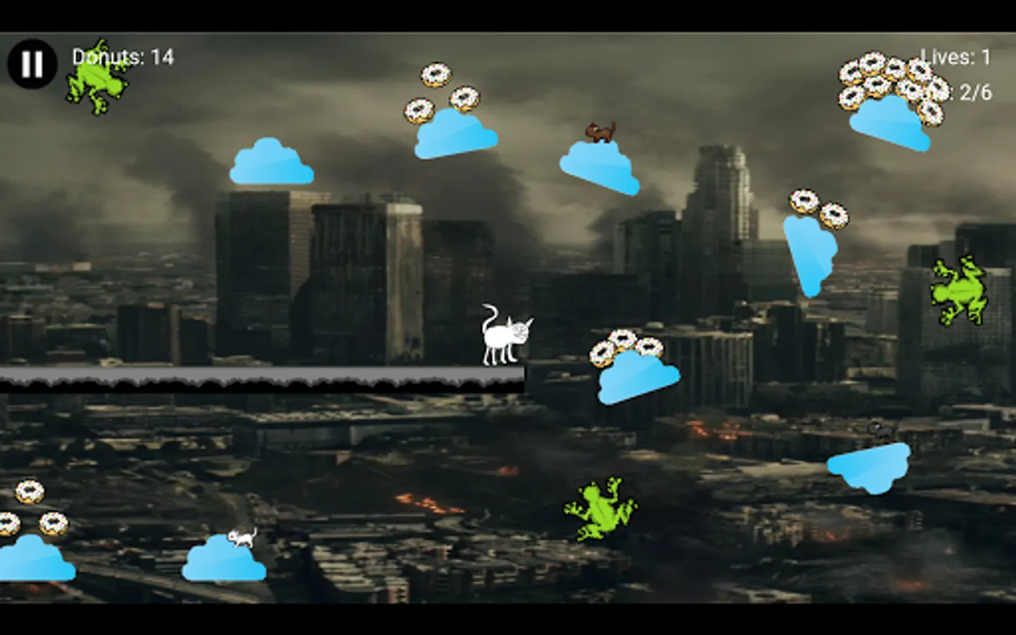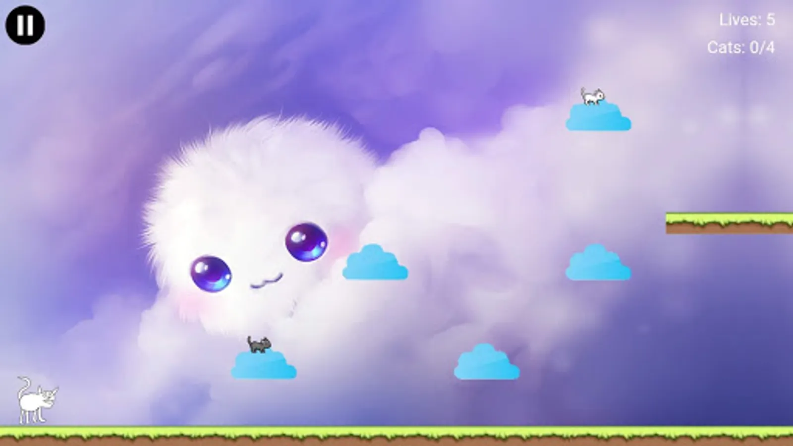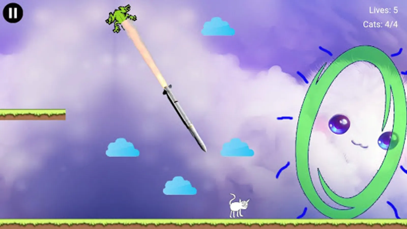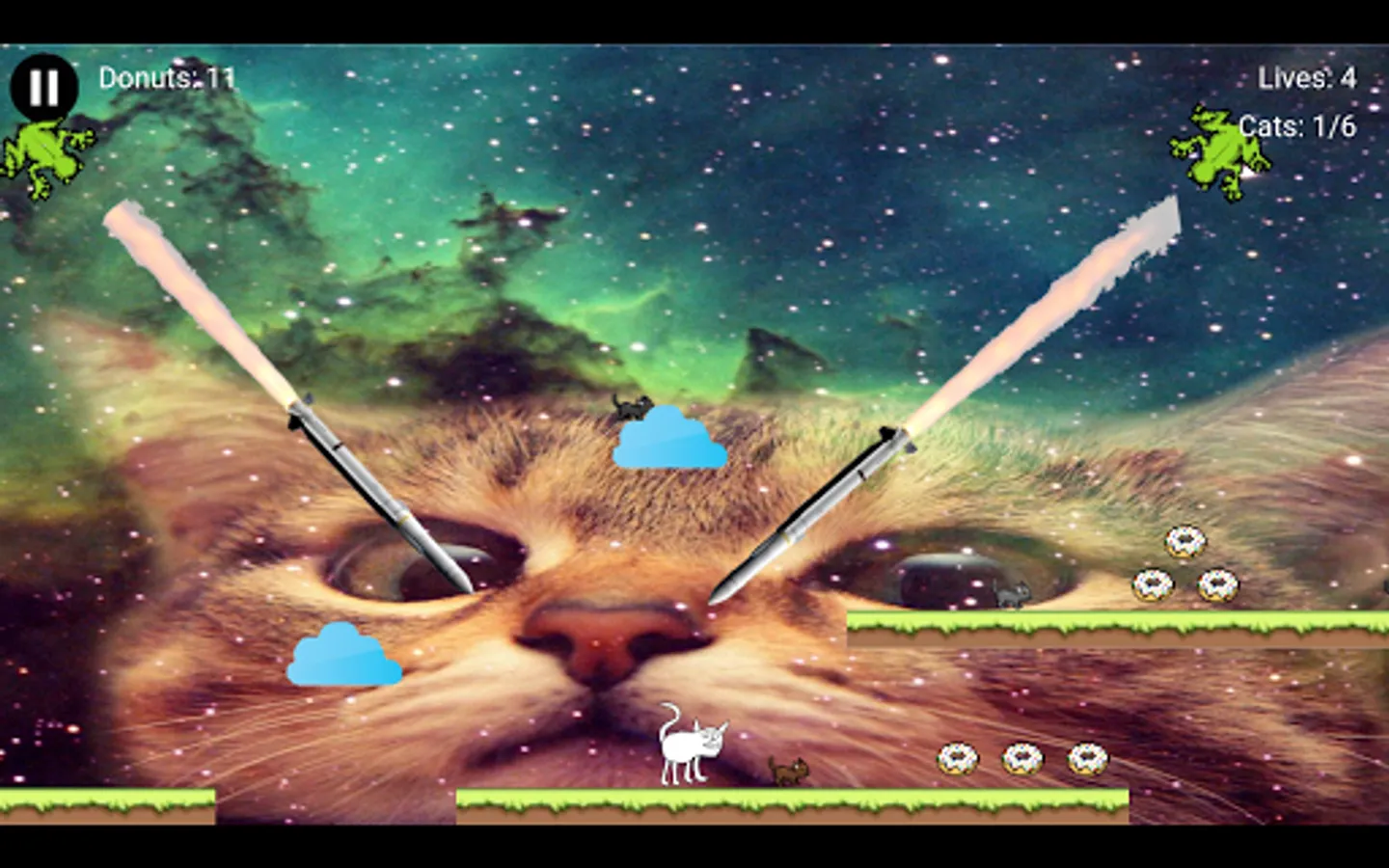 You are a cat tasked with saving your fellow felines from certain doom. Use the intuitive touch controls to navigate through distant lands to rescue your friends. Collect all the cats in a stage to trigger the Cosmic Gate to the next level. Throughout your adventure, you my encounter tasty donuts that can be used to purchase more lives. Your fellow cats are counting on you, so Accumulate Some Cats!