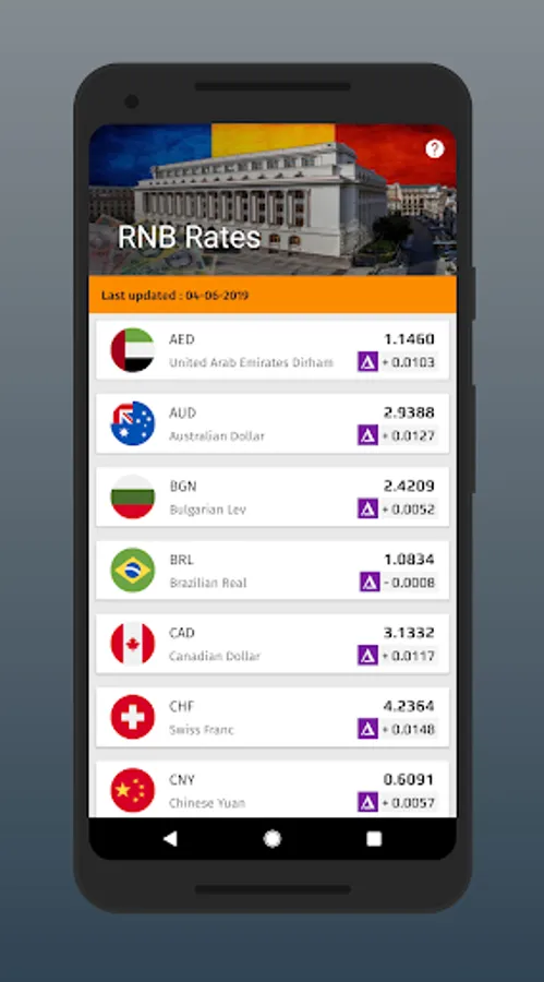 ✦ RNB Rates screen : Check out the official rates directly from the Romanian National Bank displayed in a simple but powerful list that also shows the difference between the current and last published rate for all accepted currencies.