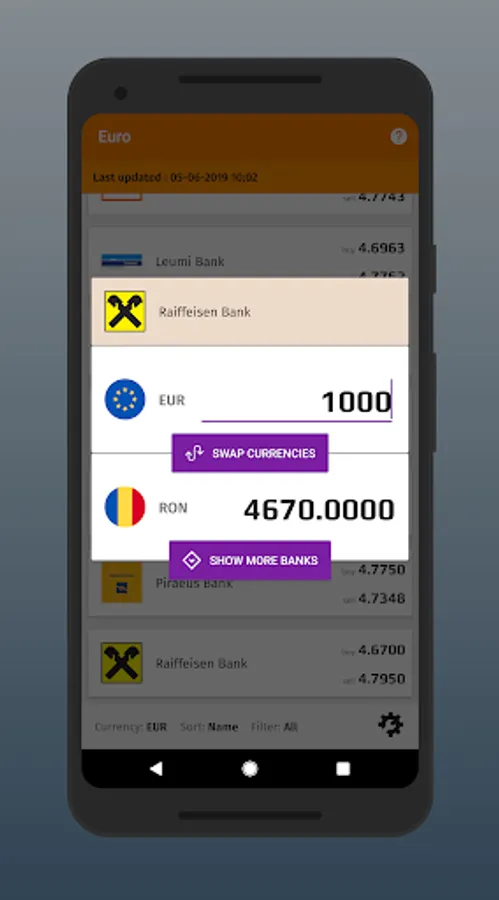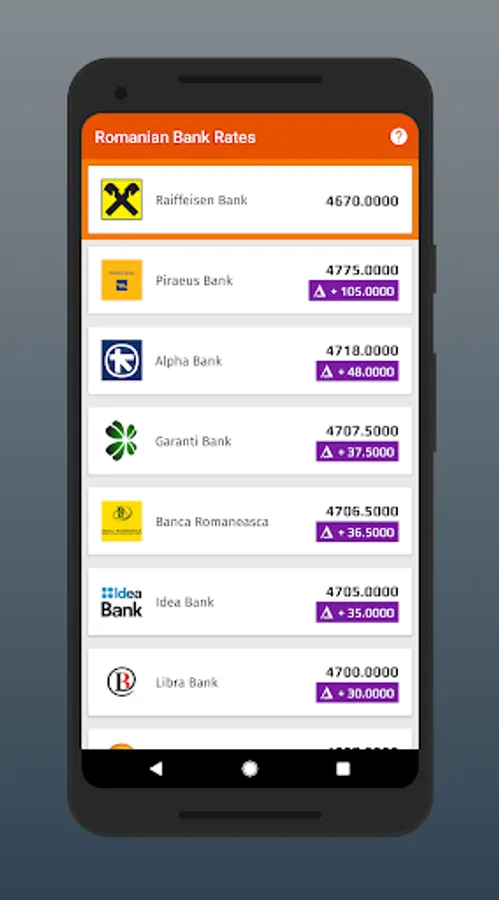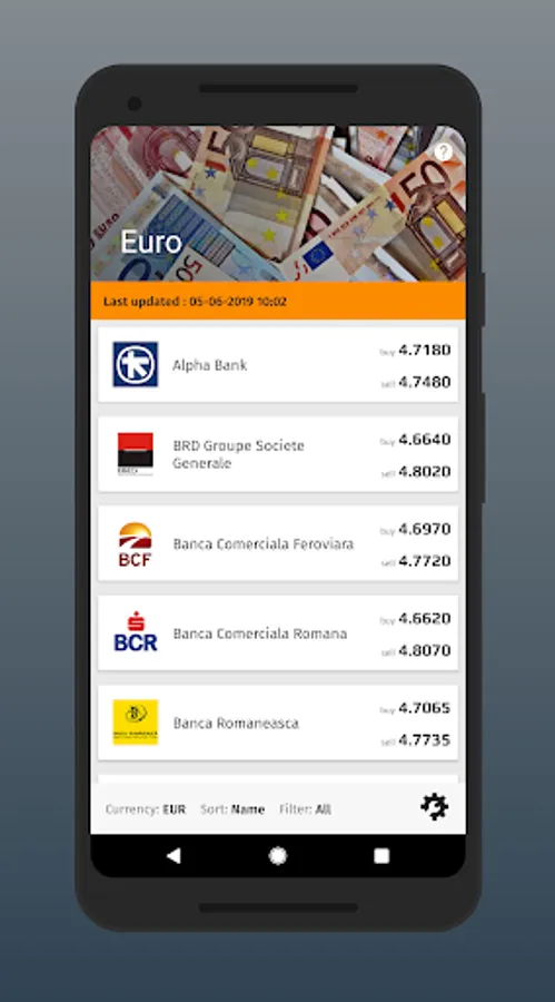✦ Bank Rates screen : Quickly see which are the sell and/or buy values for the 4 most important foreign currencies used by some of the banks in Romania, sorted and filtered any way you like.