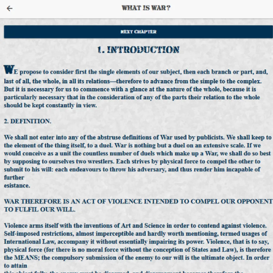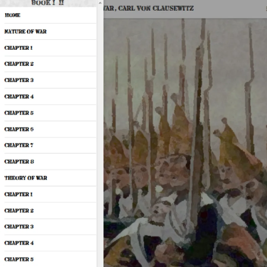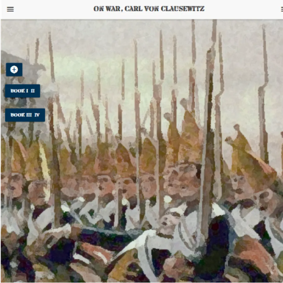 Free eBook on war and military strategy by Prussian general Carl von Clausewitz (1780–1831), written mostly after the Napoleonic wars, between 1816 and 1830, and published posthumously by his wife Marie von Brühl in 1832.[1] It has been translated into English several times as On War. On War is actually an unfinished work; Clausewitz had set about revising his accumulated manuscripts in 1827, but did not live to finish the task. His wife edited his collected works and published them between 1832 and 1835. His 10-volume collected works contain most of his larger historical and theoretical writings, though not his shorter articles and papers or his extensive correspondence with important political, military, intellectual and cultural leaders in the Prussian state. On War is formed by the first three volumes and represents his theoretical explorations. It is one of the most important treatises on political-military analysis and strategy ever written, and remains both controversial and an influence on strategic thinking