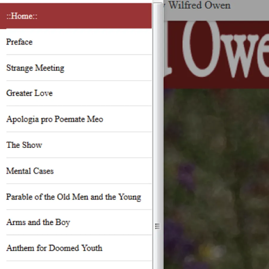 Wilfred Owen was born at Oswestry on 18th March 1893. He was educated at the Birkenhead Institute, and matriculated at London University in 1910. In 1913 he obtained a private tutorship near Bordeaux, where he remained until 1915. During this period he became acquainted with the eminent French poet, Laurent Tailhade, to whom he showed his early verses, and from whom he received considerable encouragement. In 1915, in spite of delicate health, he joined the Artists' Rifles O.T.C., was gazetted to the Manchester Regiment, and served with their 2nd Battalion in France from December 1916 to June 1917, when he was invalided home. Fourteen months later he returned to the Western Front and served with the same Battalion, ultimately commanding a Company.