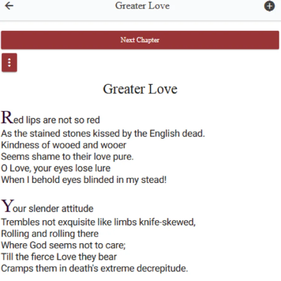 The discussion of his experiments in assonance and dissonance (of which 'Strange Meeting' is the finest example) may be left to the professional critics of verse, the majority of whom will be more preoccupied with such technical details than with the profound humanity of the self- revelation manifested in such magnificent lines as those at the end of his 'Apologia pro Poemate Meo', and in that other poem which he named 'Greater Love'.