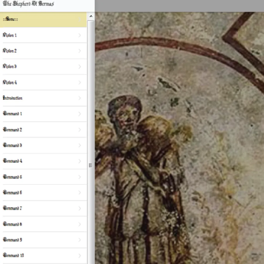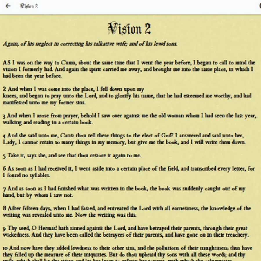 Free eBook The book consists of five visions granted to Hermas, a former slave. This is followed by twelve mandates or commandments, and ten similitudes, or parables. It commences abruptly in the first person: "He who brought me up sold me to a certain Rhoda, who was at Rome. After many years I met her again, and began to love her as a sister." As Hermas was on the road to Cumae, he had a vision of Rhoda. She told him that she was his accuser in heaven, on account of an unchaste thought the (married) narrator had once had concerning her, though only in passing. He was to pray for forgiveness for himself and all his house. He is consoled by a vision of the Church in the form of an aged woman, weak and helpless from the sins of the faithful, who tells him to do penance and to correct the sins of his children. Subsequently he sees her made younger through penance, yet wrinkled and with white hair; then again, as quite young but still with white hair; and lastly, she shows herself as glorious as a Bride.