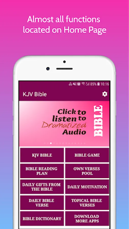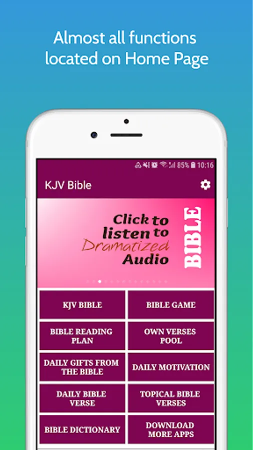 This is King James Bible App for free. It is the oldest form of the Bible in existence today. This app has been optimized for phones and for tablets. You can change the font of the text to fit bigger screens. By downloading this King James Bible, you will be getting daily notification for inspirational Bible Verses. The KJV Bible app contains both old and new testaments which make any Bible complete.