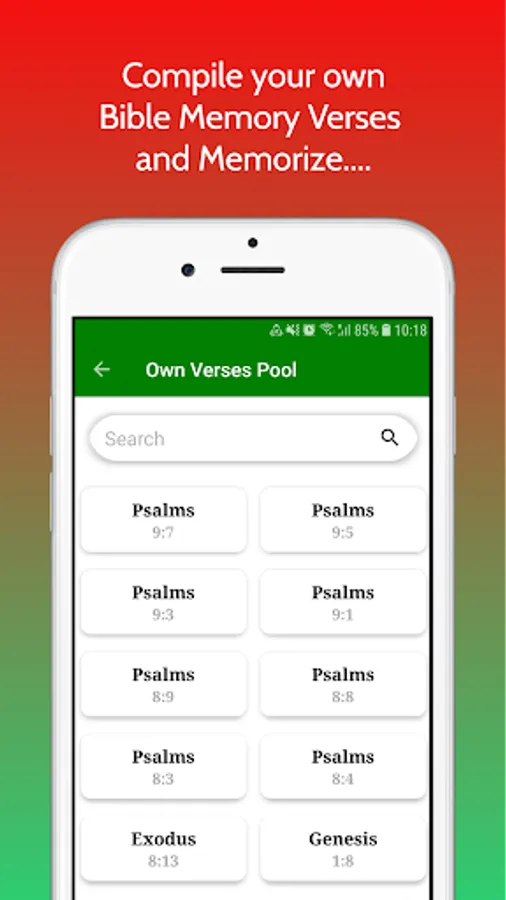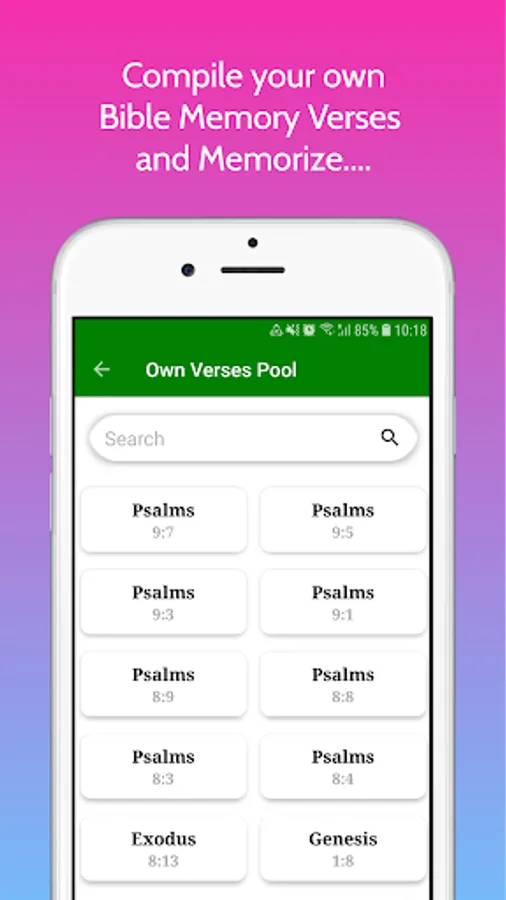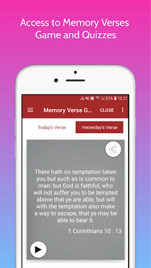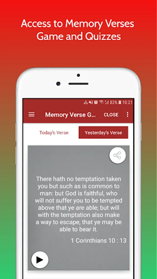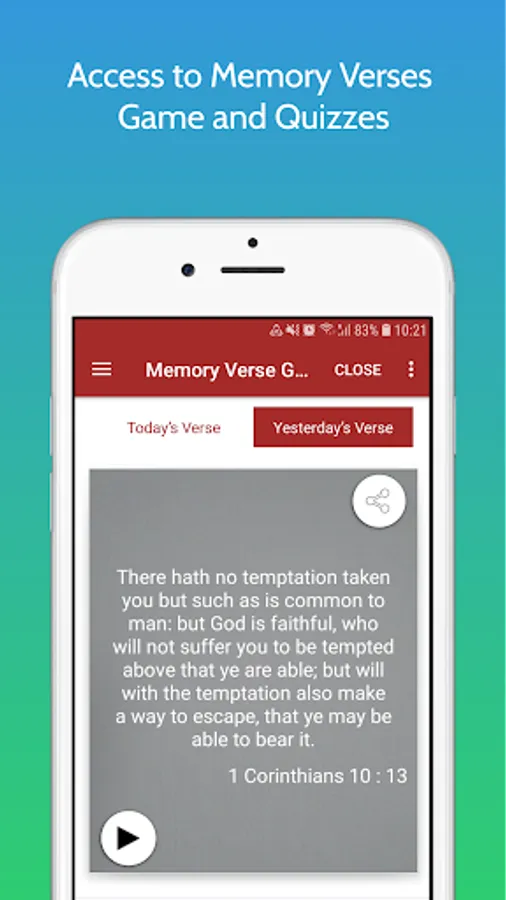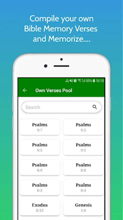 11. Bible quiz on selected verses. You can choose at settings how you want to answer the quiz. You may use your own nice pictures for the background(s) of the Bible verses. For this to work, you need to grant the app access to your photos.