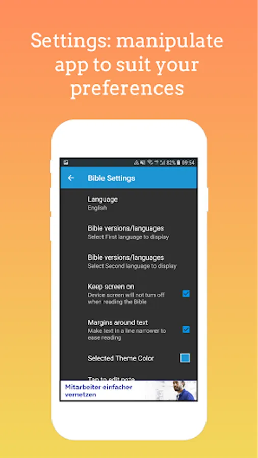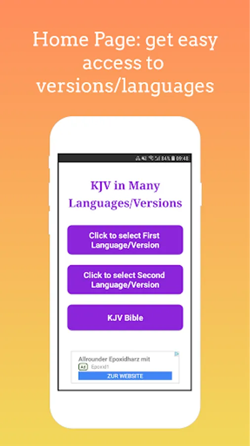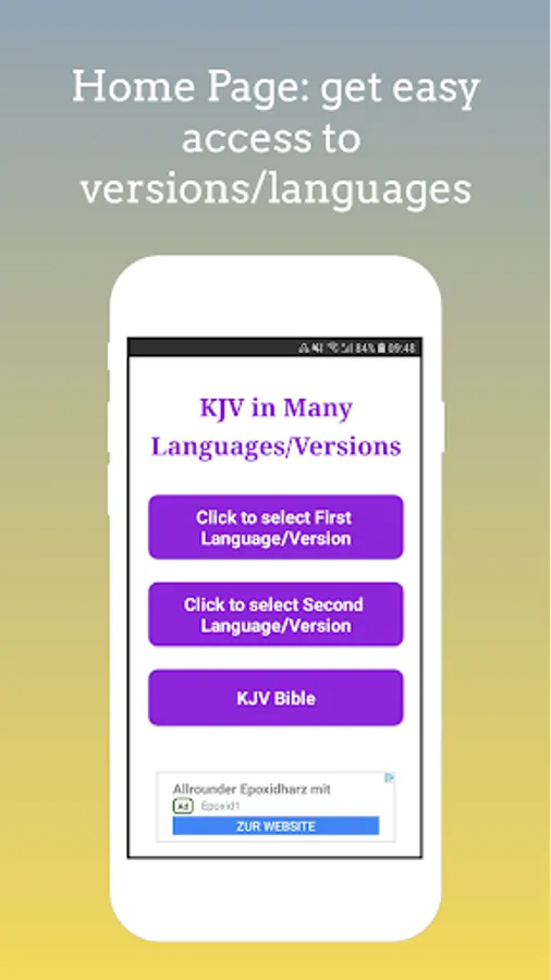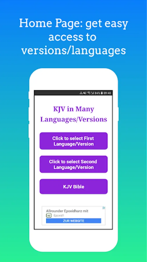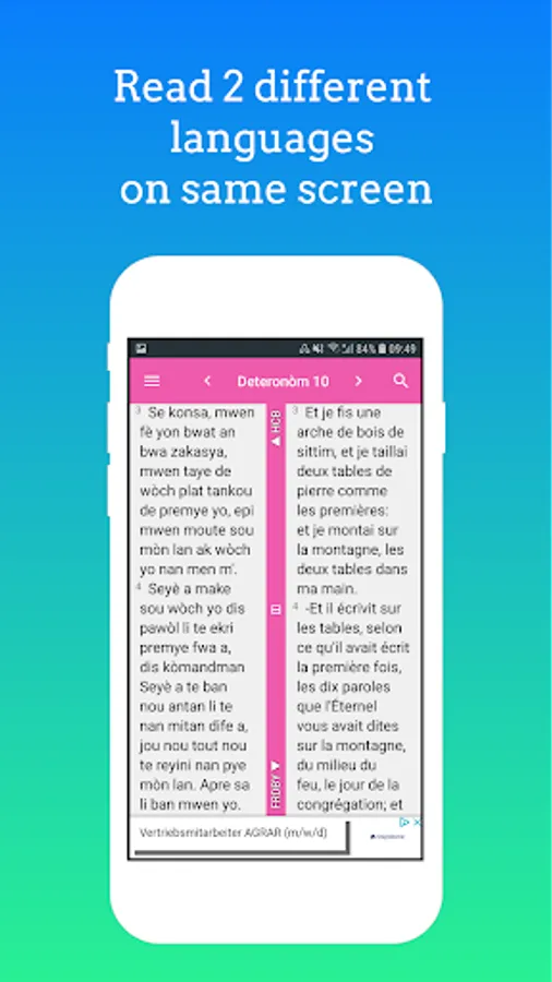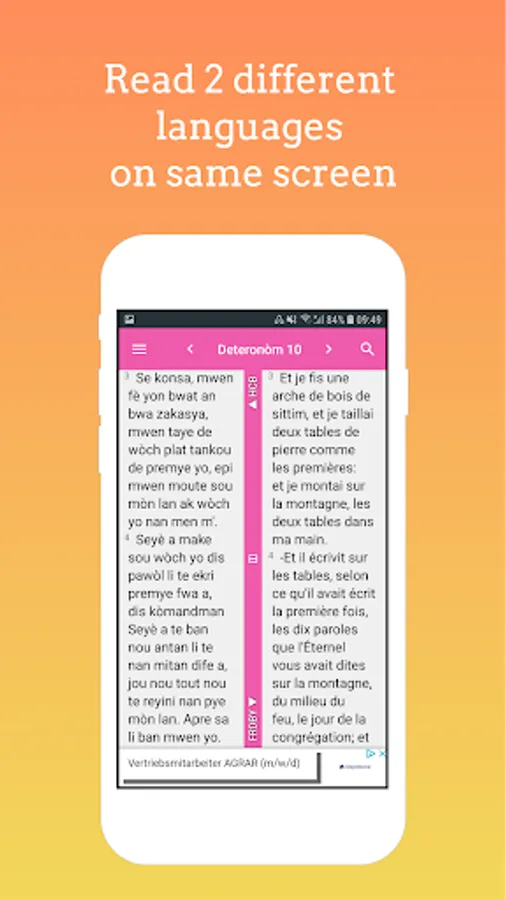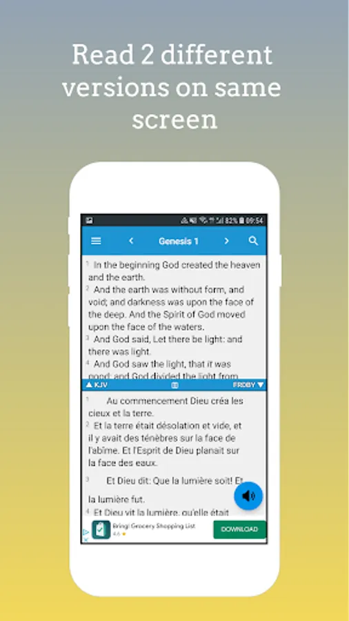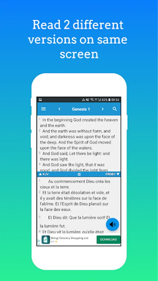 This Bible App in many languages and many versions is absolutely free. We have optimized it for mobile devices. After downloading this Bible, you will get daily notifications on encouraging Bible Verses. This App works offline, however, the audio part always needs an online connection. On same screen, you can read 2 different Bible versions or 2 different languages to better understand the Bible.