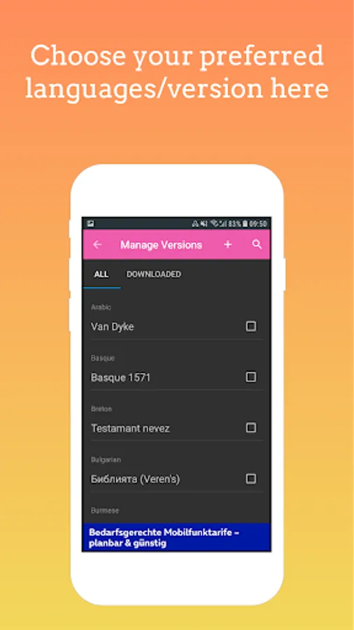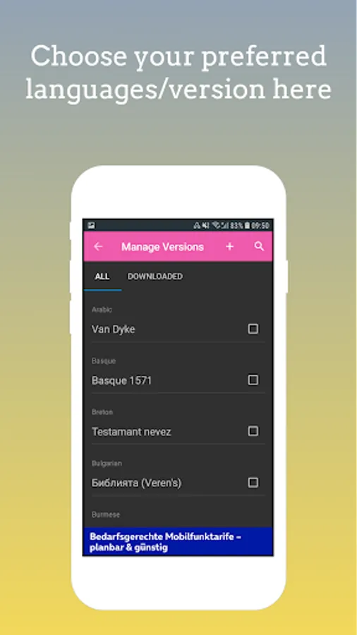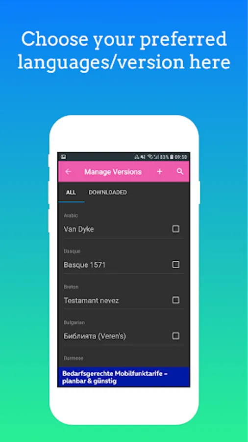 So wählen Sie eine Sprache und Version aus: Klicken Sie auf Einstellungen/Klicken Sie auf Bibelversionen (Sprachen)/Erste Sprache herunterladen, indem Sie auf das Kästchen ganz rechts klicken. Wiederholen Sie diesen Vorgang für die zweite Version (Sprache) und der Bildschirm zeigt automatisch die 2 ausgewählten Versionen / Sprachen an.