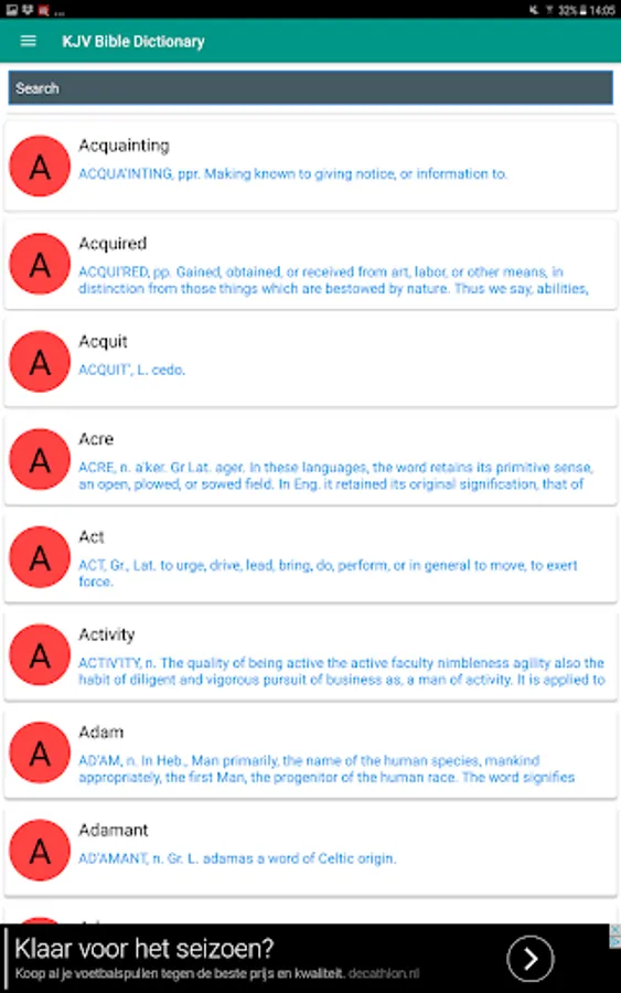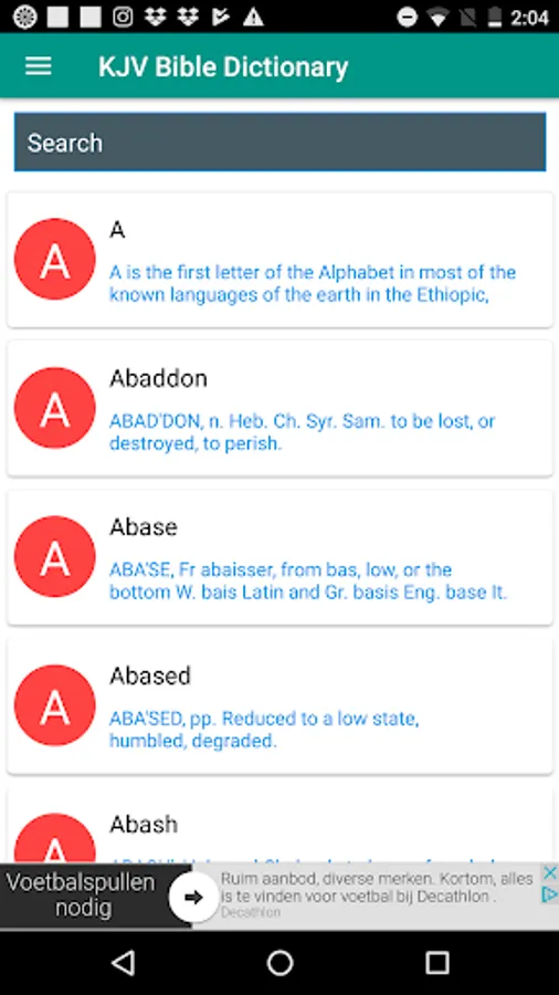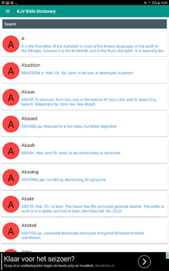 KJV Bible Dictionary app is a must have on your gadget if you desire to study the Word of God deeper and gain different perspectives. KJV Bible Dictionary offers definitions and meanings of words, names, places, persons, phrases and terms in the Bible which is really useful for studying the Scriptures.