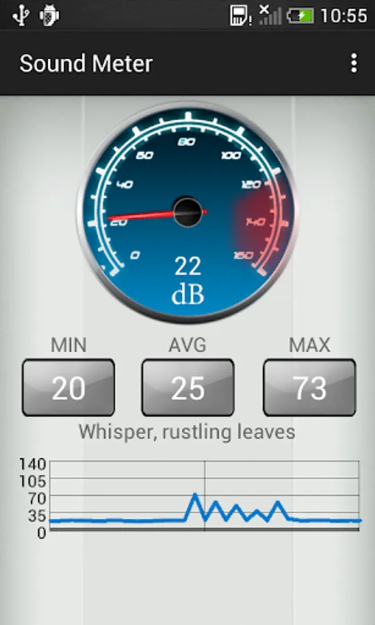 It has a nice analogue dial with arrow that points to the current decibel sound level where you are. It also has 3 displays, showing you the minimum, average and maximum volume of the sound in decibels that the app has measured.