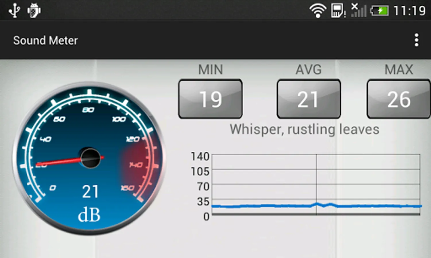 Below is a nice looking, real time graph, which shows the current and previous sound and noise level in decibels.