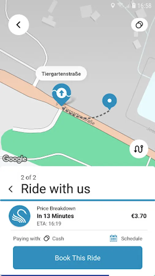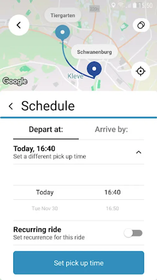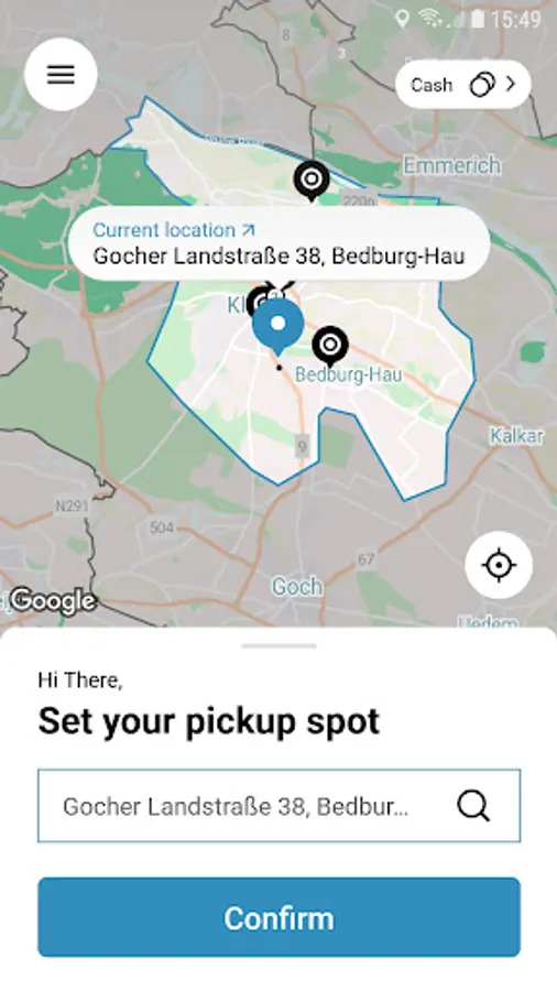 Select starting point: Locate KleveMobil app location, move the city map until the blue marker is at the desired pickup location or type the address directly into the search option.