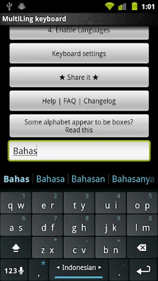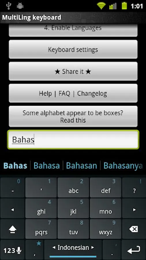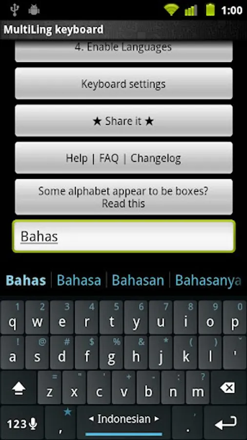 Bahasa Indonesia (Indonesian) dictionary plugin for Multiling O Keyboard. It is not an independent app, so please install OKeyboard along with this plugin.