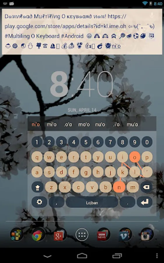 ⑴ Install this plugin and Multiling O Keyboard. https://play.google.com/store/apps/details?id=kl.ime.oh