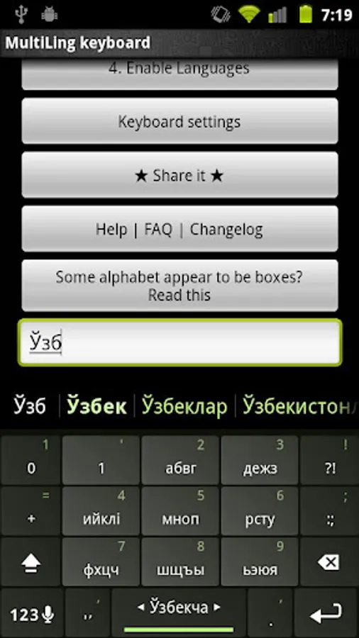 Ўзбек Dictionary plugin for Multiling O Keyboard autocorrect and word prediction